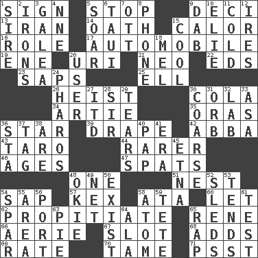 ACROSS 1. Public display of a written message 5. Obstruct or block passage 9. Tenth: prefix 13. SW Asia republic 14. Pledge 15. Bodily heat indicating an inflammation 16. Hero or heavy, e.g. 17. Car 19. Compass dir. 20. RI univ. 21. Modern: prefix 22. Begley and Asner 23. Plant excrements 25. Pipe bend 26. Robbery 30. Root beer relative 34. Nick name for Arthur 35. Mouths or openings 36. Play the lead 39. Window treatment 42. Swedish rock group 43. Pacific island yam 44. Less widely known 46. Matures 47. Arguments over trivial matters 48. Single 51. Egg locale 54. Plant excrement 57. A weed 58. _ moment's notice (2 wds.) 60. Allow 62. Conciliate 65. French philosopher Descartes 66. Nest on high 67. Notch 68. Does sums 69. Pace 70. Not wild 71. Inconspicuous attention getter DOWN 1. Beget 2. Metal shackles 3. An organ shaped like a helmet 4. Compass dir. 5. Fly high 6. "Change" in Tahitian 7. Baseball player Mel 8. Give a jingle 9. Apply (a substance) by light strokes 10. Writer Wiesel 11. Chilled 12. Angers 15. Calm and collected 18. Cartoonist voice _ Blanc 20. One who makes use of a thing 24. N Egypt peninsula 27. It would 28. Title for a knight 29. Rends 30. Unrefined 31. Globe 32. Experiment locale 33. White ___ sheet 36. R.R. building 37. Label 38. "We ___ not amused" (Victoria) 40. Infant food 41. Period 45. Inactive volcano in Sicily 48. Migrant worker of the '30s 49. Fish or hair follower 50. Be 52. Bobsleighs 53. Watches over 54. Practice fight 55. Length times width 56. Sweet dark-red dessert wine 58. Tiny particle 59. Wig 61. Trial 63. Sliced dessert 64. According to 65. Hit sharply and swiftly