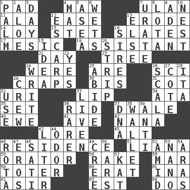 ACROSS 1. Groovy apt. 4. Informal term for the mouth 7. ____ Bator, Mongolia 11. According to 12. Comfort 13. Eat (away) 14. Myrna of the movies 15. Proofreading order 16. Chalkboards 17. Of or pertaining to a meson 19. Helper 21. 24 hours 23. Relationship diagram 24. We are 25. "We ___ not amused" (Victoria) 26. _-fi 29. Dice game 30. Again 31. Small bed 32. RI univ. 33. Mouth edge 34. _ moment's notice (2 wds.) 35. Put into a specified state 36. To free from 37. A sleeping potion; an opiate (poet.) 40. She-sheep 41. "___ Maria" 42. Nanny 43. Old wives' tales, e.g. 45. The first octave above the treble staff 46. Dwelling 51. Woody, climbing, usually tropical plant 55. Speaker 56. Immoral or dissolute person 58. Spoil 59. Carrier 60. Part of Q.E.F. 61. _ tizzy (2 wds.) 62. SW Saudi Arabia district 63. Eastern Standard Time (abbr.) 64. Two (Sp.) DOWN 1. Inside of hand 2. Medicinal plant 3. 24-hour periods 4. Floor protector 5. Toward the sea 6. Moistens 7. A salt of uric acid 8. Globular water bottle used in Asia 9. An important port of Yemen 10. A home for chicks 12. Fortification 13. Otherwise 16. Founders of families 18. The main thing one is thinking about 20. Long narrow piece of something 22. It is so 24. Compose 25. Remain 26. Any of the three canals of the cochlea 27. ____ d'Azur (French Riviera) 28. Call ___ day 29. Group working together 32. Purpose 33. Make or become more lively 36. More valued for its uncommonness 37. Heredity factor (abbr.) 38. Place for singles 39. Opposed to 43. 61 cubic inches 44. Scent 46. Roll call or roster of names 47. Greek god of love 48. Suttee (variant) 49. Algonquian 50. Hearing organs 52. Among 53. Billionth: prefix 54. Caspian sea tributary 57. Krazy ___ of comics