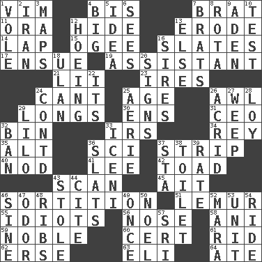 ACROSS 1. Zeal 4. Altar cloth linen 7. Naughty child 11. Mouth or opening 12. Flintstone garb 13. Wear away 14. Infant locale 15. Double curve, resembling the letter S 16. Chalkboards 17. Follow as a consequence or result 19. Aide 21. Cards in a Roman deck? 23. Angers 24. Patter 25. Grow older 26. Leather borer 29. Yearns 30. Followers of ems 31. Corporate head (abbr.) 32. Storage container 33. Big collection agency 34. Marina Del _, California 35. The first octave above the treble staff 36. _-fi 37. Long narrow piece of something 40. Allow head to fall sleepily 41. Area sheltered from the wind 42. Frog relative 43. Examine hastily 45. Small island 46. Determination 51. Arboreal primate 55. Foolish or stupid persons 56. Characteristic smell of wine 58. Black tropical American cuckoo 59. Impressive in appearance 60. Foregone conclusion 61. To free from 62. Celtic language 63. Biblical high priest 64. Had dinner DOWN 1. Short-tailed, large-bodied rat 2. SW Asia republic 3. Atlas contents 4. Of large size 5. The main thing one is thinking about 6. Perceives with the eye 7. Naughty children 8. Roll call or roster of names 9. An important port of Yemen 10. Trial 12. Weeding 13. Otherwise 16. Founders of families 18. ____ Bator 20. Signals 22. It is 24. Continued (abbr.) 25. Nest on high 26. Bitter 27. Shed a tear 28. Myrna of the movies 29. _ and Stitch 32. Prohibit 33. Ancient Celtic tribe of eastern Britain 36. Narrow boards 37. R.R. building 38. Rest room 39. Assign a rank or rating to 43. Took without asking 44. Quote 46. Trig term 47. Aroma 48. Teases 49. At one time in the past 50. Christmas carol 52. Hindu Mythology: god of death 53. A single undivided whole 54. Travel on or in a vehicle 57. _ Lanka