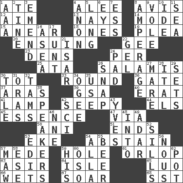 ACROSS 1. Had dinner 4. Toward shelter 8. Advice 12. Direct toward a target or goal 13. Negative votes 14. Method 15. Approach 18. Singles 19. Entreaty 20. Taking place subsequently 22. Turn to the right 23. Habitations of wild animals 24. For each 25. _ moment's notice (2 wds.) 26. Deli grouping 30. Small child 33. One shot 36. Yard entry 37. Caspian sea tributary 39. Girls' org. (abbr.) 40. Part of Q.E.F. 41. Desk light 42. Oozy 44. Raised railways 45. Gist 47. By way of 50. Cuckoo 51. Conclusions 53. Make supply last 54. Refrain by choice 57. Ancient Persian 59. Opening into or through something 61. Fourth or lowest deck 63. SW Saudi Arabia district 64. Small island 65. Nilotic language 66. Soaks 67. Fly high 68. Fast jet (abbr.) DOWN 1. American Automobile Association (abbr.) 2. Prong on a fork 3. Make improvements or corrections to 4. Soon (poet.) 5. Austrian-born American filmmaker Fritz 6. Sight organ 7. Double-curved letter 8. Electrical Measurement 9. Grand slam 10. Binary compound 11. Ocean 16. At sea 17. Undersized animal 21. Austrian river, tributary to the Danube 22. Set 24. Writing tablet 26. Fastener 27. Female horse 28. Slanted text style (abbr.) 29. Puts into a specified state 30. Falsehood 31. Mouths or openings 32. Scottish caps 34. Double curve, resembling the letter S 35. Purpose 38. Orators 42. _-fi 43. Jacques Cousteau's middle name 46. Compass dir. 48. To the inside or interior of 49. The sixth month of the Jewish calendar 52. Beverly of Met fame 53. Prepare for publication 54. Silent film actress Nazimova 55. Fermented drink made from hops 56. Common sense 57. Informal term for the mouth 58. Compass dir. 59. Part of HMS, perhaps 60. Bear (Spanish) 62. Cooking vessel