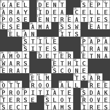 ACROSS 1. Highlander 5. Gouge 9. Back-to-school mo. 13. Like ___ of sunshine 14. The content of cognition 15. Cell (Danish) 16. Introduce or present, as a question 17. Pleas 19. Compass dir. 20. Nanny (var.) 21. Compass dir. 22. Consume 23. Liveliness 25. It is 26. Vertical member of a panel or frame 30. Dad 34. Settings 35. SW Asia republic 36. Mine, in Marseilles 39. Prevent from occurring 42. Inactive volcano in Sicily 43. Armed conflicts 44. Moral principle 46. Part of Q.E.F. 47. Biscuitlike quick bread 48. Shade tree 51. Russian ruler of old 54. Baseball player Mel 57. Friend of Pooh 58. Everything 60. To sift 62. Conciliate 65. Neighbor of Neb. 66. Laconic 67. Groove 68. Be footloose 69. Religious group 70. Scottish caps 71. Angers DOWN 1. Yawn 2. Came up 3. Artist's stand 4. Sodium hydroxide 5. South Vietnam president (1954) 6. Pulitzer Prize-winning author Ferber 7. Fish or hair follower 8. Tarsus (plural) 9. Arrange properly for use 10. Writer Wiesel 11. Entreaty 12. Trial 15. Crow sounds 18. Eastern Standard Time (abbr.) 20. Against 24. Help 27. It would 28. Area sheltered from the wind 29. _____ Park, CO 30. Components 31. Tate display 32. Baking dish 33. Santa ___, CA 36. Deep reverence 37. Make imperfect 38. Mouth or opening 40. And so on (abbr.) 41. 17th letter of the Greek alphabet 45. International (abbr.) 48. One of the Great Lakes 49. Car dealer's back yard 50. Wet 52. Zeal 53. Rob, plunder, or pillage 54. Elects 55. Woody plant 56. Torque (variant) 58. Tiny particle 59. Allows 61. Makes supply last 63. Pacific Standard Time (abbr.) 64. Insect wing 65. Indian title of respect (Mr.)