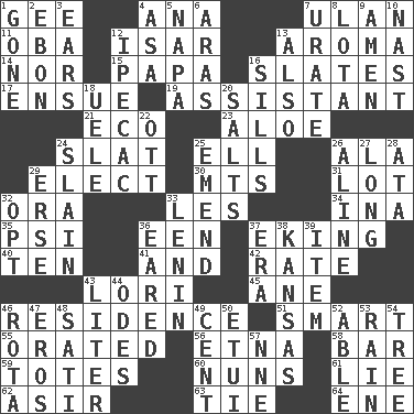 ACROSS 1. Unit of force equal to gravity 4. Santa ___, CA 7. Uhlan (variant) 11. Chief or king in Benin or Nigeria 12. Austrian river, tributary to the Danube 13. Scent 14. And not 15. Dad 16. Chalkboards 17. Follow as a consequence or result 19. Aide 21. Environmental prefix 23. _ vera 24. Narrow board 25. Pipe bend 26. In the manner of 29. Choose 30. Mountains (abbr.) 31. Car dealer's back yard 32. Mouth or opening 33. French article 34. _ tizzy (2 wds.) 35. Air pressure measure (abbr.) 36. Car or cant ending 37. Supplementing with great effort 40. Nine, plus one 41. Plus 42. Assign a rank or rating to 43. Australian parrot (variant) 45. A saturated hydrocarbon 46. Dwelling 51. Don Adams' spy role 55. Declaimed 56. Inactive volcano in Sicily 58. Oblong piece of solid material 59. Hauls 60. Religious women 61. Whopper 62. SW Saudi Arabia district 63. Neckwear 64. Compass dir. DOWN 1. Went 2. Inky black, to poets 3. Hearing organs 4. White ___ sheet 5. California wine valley 6. Caspian sea tributary 7. A salt of uric acid 8. Globular water bottle used in Asia 9. So be it 10. Political cartoonist Thomas 12. Medicinal drug used to evoke vomiting 13. In addition 16. Beverly of Met fame 18. Ubangi River tributary 20. Table seasonings 22. Baseball player Mel 24. Killed 25. Make improvements or corrections to 26. Place in a line 27. Yearn 28. "One Day ___ Time" 29. Celtic language 32. Choose 33. Soviet premier 1918-24 36. Having ears or earlike features 37. Period 38. Sunflower state 39. A whole individual unit 43. 61 cubic inches 44. Lyric poems 46. Roll call or roster of names 47. Greek god of love 48. Suttee (variant) 49. Penny 50. Needle case 52. Competent 53. Precipitation 54. Relationship diagram 57. Compass dir.