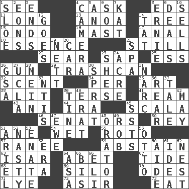 ACROSS 1. Observe 4. Keg 8. Begley and Asner 11. Yearn 13. Small Philippine buffalo 14. Family _ (genealogy) 15. Southwest Nigerian state 16. Vertical spar for supporting sails 17. Of or related to the anus 18. Core 21. Not moving 22. Scorch 23. Plant excrement 25. Double-curved letter 26. Chewing product 29. File 13 32. Aroma 34. For each 35. Nonscientific branch of learning 38. Came down and settled, as after flight 39. Laconic 41. 480, 500 or 516 sheets of paper 43. Cuckoo 44. Retirement account (abbr.) 45. Any of the three canals of the cochlea 46. Elected representatives 50. Marina Del _, California 51. A saturated hydrocarbon 54. Soggy 55. Printing process, for short 57. The wife of a rajah (variant) 59. Refrain by choice 63. Austrian river, tributary to the Danube 64. Collude with 67. Periodic rise and fall of the sea level 68. Singer James 69. Grain storage tower 70. Lyric poems 71. Sodium hydroxide 72. SW Saudi Arabia district 73. Erode DOWN 1. _ gin 2. Immeasurably long periods of time 3. Extremities 4. Device for capturing images 5. Santa ___, CA 6. Distress signal 7. Krazy ___ of comics 8. Bert's buddy 9. Allots cards 10. Makes a sale 12. Leaves 14. Make lace 19. Remaining after all deductions 20. Automobile 21. Health resort 23. "______ My Girl" (Turtles hit) 24. Land measure 26. Girls' org. (abbr.) 27. Southern CA. univ. 28. Count _ (2 wds.) 30. Small fatty European fish 31. Drug cop 33. Nuclear Threat Initiatives 36. Bring up, as a child 37. Lie 39. Prong on a fork 40. Part of Q.E.F. 42. Can I? 45. Fast planes 47. She-sheep 48. Speaker 49. Director Reiner 51. Satellite of Uranus 52. Characterized by obscenity 53. Maternal 56. "Beetle Bailey" pooch 58. Period 60. Assistant 61. It may be bright or harebrained 62. A home for chicks 64. White ___ sheet 65. Altar cloth linen 66. Biblical high priest