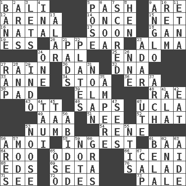 ACROSS 1. Indonesian resort city 5. Romantic infatuation 9. "We ___ not amused" (Victoria) 12. Sports stadium 14. At one time in the past 15. Fish or hair follower 16. Brizilian seaport 17. Within a short period 18. Separate the seeds from cotton 19. Double-curved letter 20. Become visible 23. _ mater 24. Of the mouth 25. Inside; within (prefix) 27. Precipitation 30. Daniel's nick name 32. Heredity factor (abbr.) 33. Singer Murray 34. Portico 36. Epoch 38. Writing tablet 39. Shade tree 40. Actress Charlotte 43. Baseball player Mel 46. Plant excrements 48. Southern CA. univ. 49. Auto club (abbr.) 51. Born 52. Not this but _ 53. Unfeeling 54. French philosopher Descartes 56. Mine, in Marseilles 58. Consume 61. Sound made by sheep 64. Friend of Pooh 65. Aroma 66. Ancient Celtic tribe of eastern Britain 68. Begley and Asner 69. Stalk of a moss capsule 70. First course 71. Observe 72. Lyric poems 73. Light colored DOWN 1. Object of repulsion 2. Caspian sea tributary 3. Allows 4. _ tizzy (2 wds.) 5. Airs 6. Small Philippine buffalo 7. Tallied 8. Layer 9. White American of non-Hispanic descent 10. 480, 500 or 516 sheets of paper 11. Inactive volcano in Sicily 13. Having or resembling wings 21. Writing tablets 22. Food holders 23. The sixth month of the Jewish calendar 24. Single 26. Compass dir. 27. Strike 28. Santa ___, CA 29. Southeast Asian peninsula 31. Pitcher Ryan 35. Electrical Unit 37. Bowlike part 41. Chicken ___ king 42. Ingest 44. "Change" in Tahitian 45. Scottish cap 47. Observes 48. Shoshoni 50. Remained 53. Trap for birds or small mammals 55. Nuclear Threat Initiatives 56. Ancient Greek god of war 57. Method 59. Observe 60. Pate de foie ____ 61. Actor Lugosi 62. Of or related to the anus 63. Helper 65. Bear (Spanish) 67. Head covering
