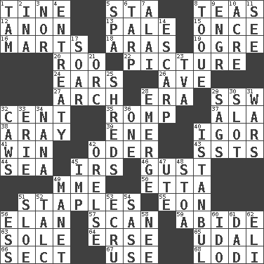 ACROSS 1. Prong on a fork 5. R.R. building 8. Beverages made from leaves 12. At once, immediately (arch.) 13. Light colored 15. At one time in the past 16. Shops 18. Ancient river in northeast Turkey 19. Legendary monster 20. Friend of Pooh 22. Photo 24. Hearing organs 26. "___ Maria" 27. Bowlike part 28. Period 29. Compass dir. 32. Penny 35. Play 37. According to 38. Like ___ of sunshine 39. Compass dir. 40. Composer Stravinsky 41. Acquire through effort 42. Baltic tributary 43. Fast planes 44. Ocean 45. Big collection agency 46. Abrupt rush of wind 49. Madame (abbr.) 50. Singer James 51. Paper fasteners 55. Period of immesurable duration 56. Liveliness 57. Examine hastily 59. Stay 63. Not divided or shared with others 64. Celtic language 65. Hereditary estate 66. Religious group 67. Purpose 68. Farming town in central California DOWN 1. Scottish cap 2. _ tizzy (2 wds.) 3. And not 4. Plea 5. Health resort 6. Canvas cover 7. Jai _ 8. Woman's close-fitting hat 9. Engineer (abbr.) 10. Measure of real estate 11. Observe 14. Fortification 17. Fly high 21. The grampus (Milton) 23. Federal power corp. 25. Tears up 28. Develop 29. Sinks 30. Groove 31. Armed conflicts 32. Crow sounds 33. One of the Great Lakes 34. Nanny 36. Single 40. Byzantium, centuries later 42. Threatening words 45. Mischievous child 47. Shoshoni 48. Portico 49. French painter Edouard 51. A type of plum 52. Baby powder 53. Shade of tan 54. Backtalk 56. Curvy letter 58. Born 60. Wedding promise 61. June honoree 62. Biblical high priest