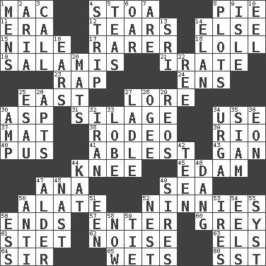 ACROSS 1. Big _ 4. Portico 8. Sliced dessert 11. Period 12. Pulls into pieces 14. Otherwise 15. The longest river in the world 17. Less widely known 18. Hang loosely or laxly 19. Deli grouping 21. Feeling or showing extreme anger 23. Strike 24. Followers of ems 25. 90 degrees 27. Old wives' tales, e.g. 30. Cleo's killer 31. Fodder prepared in a silo 34. Purpose 37. Floor covering 38. Cowboy competition 39. River (Sp.) 40. Fluid product of inflammation 41. Most capable 43. Separate the seeds from cotton 44. Leg joint 45. Dutch treat 47. Santa ___, CA 49. Ocean 50. Having winglike extensions 52. Simpletons 56. Extremities 57. Keyboard key 60. Jennifer or Joel 61. Proofreading order 62. Annoying sound 63. Raised railways 64. Title for a knight 65. Moistens 66. Fast jet (abbr.) DOWN 1. Not women's 2. Operatic vocal solo 3. Give a ring to 4. Remove all contents or possession from 5. Beverages made from leaves 6. Rowing implement 7. "We ___ not amused" (Victoria) 8. Schemes 9. Small island 10. Snakelike fish 13. _ Lanka 14. Liveliness 16. Hearing organs 20. Floor coverings 22. To riddle 25. Son of Isaac 26. Flats, for short 27. Dipping utensil 28. Double curve, resembling the letter S 29. Vintage cars 30. Electrical Unit 32. SW Asia republic 33. Ear part 34. Capital and largest city of Mongolia 35. Thailand, formerly 36. Period of immesurable duration 42. Adolescent 44. Krazy ___ of comics 46. Mild oath, euphamism for damn 47. Tree or shrub in the Birch family 48. Political cartoonist Thomas 49. Begets 50. Opposed to 51. Car or cant ending 52. A home for chicks 53. Angers 54. Snakelike fish 55. System (abbr.) 56. Double-curved letter 58. At this time 59. Neckwear