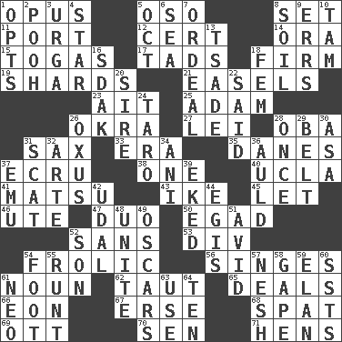 ACROSS 1. Musical composition 5. Bear (Spanish) 8. Put into a specified state 11. Left side of a ship or aircraft 12. Certainty 14. Mouth or opening 15. Ancient Roman robes 17. Bits 18. Become taut 19. Broken pieces 21. Artist's stands 23. Small island 25. First of billions? 26. Gumbo ingredient 27. Flowery wreath 28. Chief or king in Benin or Nigeria 31. Saxophone 33. Epoch 35. Natives or inhabitants of Denmark 37. Shade of tan 38. Single 40. Southern CA. univ. 41. Taiwanese island in East China Sea 43. Mamie's mate 45. Allow 46. Shoshoni 47. Superhero pair 50. Mild oath 52. Without 53. HTML Container Element 54. Romp 56. Burns superficially 61. Part of speech 62. Tense 65. Allots cards 66. Period of immesurable duration 67. Celtic language 68. Petty quarrel 69. Baseball player Mel 70. Elected rep. 71. Coop moms DOWN 1. Chooses 2. "Silly old bear" 3. Capital and largest city of Mongolia 4. Play the lead 5. Sep. follower 6. Ocean 7. Severe or trying experience 8. Earth 9. Blunders 10. Scottish cap 13. Sadhe (variant) 16. Neighbor of Neb. 18. Opposite of masc. 20. Male parent of an animal 22. Expressed in words 24. Edible starchy tuberous root 26. Amu Darya 28. Single time 29. Waist strap 30. White ___ sheet 31. Get outta here! 32. Johnson of "Laugh-In" 34. Black tropical American cuckoo 36. Old (Scot.) 37. Australian flightless bird 39. Made supply last 42. Hereditary estate 44. Armor plate that protects the chest 48. Join together 49. Motion picture awards 51. Enthusiastic 52. Male child 54. Lowest support of a structure 55. Undersized animal 57. Tender 58. Open wide 59. Style 60. Fast planes 61. Modern: prefix 63. Purpose 64. "___ Little Indians"