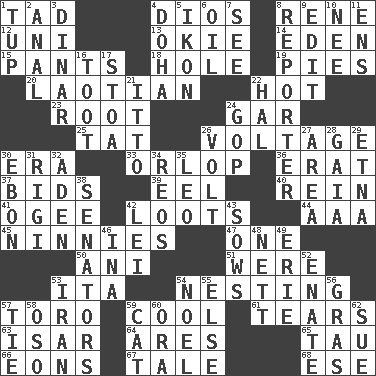 ACROSS 1. Small amount or degree 4. "Vaya con ____" 8. French philosopher Descartes 12. Corn or form start 13. Migrant worker of the '30s 14. Paradise 15. Leg coverings 18. Hollow 19. Sliced desserts 20. Of or relating to Laos or its people 22. Being at a high temperature 23. Carrot, for example 24. Slender fish 25. Make lace 26. Electrical Measurement 30. Epoch 33. Fourth or lowest deck 36. Part of Q.E.F. 37. Auction offers 39. Snakelike fish 40. It's straight from the horse's mouth 41. Double curve, resembling the letter S 42. Plunders 44. Auto club (abbr.) 45. Simpletons 47. Single 50. Black tropical American cuckoo 51. We are 53. Call ___ day 54. Nestling 57. "Corrida" creature 59. Calm and collected 61. Lacerates 63. Austrian river, tributary to the Danube 64. Ancient Greek god of war 65. The 19th letter of the Greek alphabet 66. Immeasurably long periods of time 67. Falsehood 68. Compass dir. DOWN 1. Uncastrated adult male sheep 2. Of or related to the anus 3. Middle Eastern gold or silver currency 4. Capital of the state of Qatar 5. Picture 6. Lubricate 7. Perceive with the eye 8. News announcer 9. Prepare for publication 10. Born 11. Followers of ems 16. A blast of a horn 17. Portico 21. "Tell ____ the Marines!" 22. Actor Linden 24. Republican Party 26. Electrical Unit 27. Length times width 28. Greek goddess of the earth (variant) 29. Inactive volcano in Sicily 30. Inky black, to poets 31. Swiss mountan, "Queen of the Mountains" 32. Arabian gulf 34. Vintage cars 35. Lion 38. Elected representatives 42. Luau accessory 43. Sty mamas 46. _ tizzy (2 wds.) 48. Remaining after all deductions 49. One of the Great Lakes 52. Maternal 53. SW Asia republic 54. Christmas carol 55. Otherwise 56. Pate de foie ____ 57. Make a knot 58. Bear (Spanish) 59. Feline 60. Mouth or opening 62. Take to court