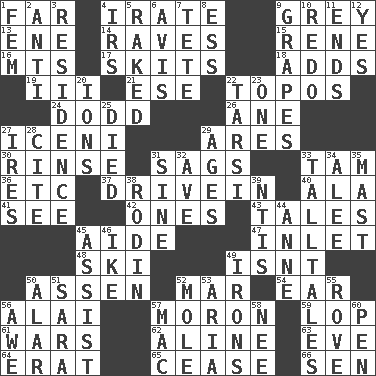 ACROSS 1. Distant 4. Feeling or showing extreme anger 9. Jennifer or Joel 13. Compass dir. 14. All-night dance parties 15. French philosopher Descartes 16. Mountains (abbr.) 17. Burlesque acts 18. Sums up 19. One more than two 21. Compass dir. 22. Literary convention 24. Texas town _ City 26. A saturated hydrocarbon 27. Ancient Celtic tribe of eastern Britain 29. Ancient Greek god of war 30. Remove soap 31. Droops 33. Scottish cap 36. And so on (abbr.) 37. Popular '50s hangout 40. According to 41. Perceive with the eye 42. Singles 43. Lies 45. Helper 47. An arm off of a larger body of water 48. What Jean-Claude Killy likes to do 49. Is not 50. NE Netherlands city 52. Third mo. 54. Ewer handle 56. Jai ____ 57. Person of subnormal intelligence 59. Trim (branches) 61. Armed conflicts 62. Place in a line 63. Night before a holiday 64. Part of Q.E.F. 65. Desist 66. Elected rep. DOWN 1. Opposite of masc. 2. Opposed to 3. Dwelling 4. Big collection agency 5. Swept the length of 6. Deliberation 7. Wig 8. Double-curved letter 9. Wine fruits 10. Redecorate 11. Conclusions 12. Affirmative reply 20. Charged atoms 22. Tarsus (plural) 23. Single 25. Passed on 27. Angers 28. Quote 29. Eras 31. Trig term 32. "___ Maria" 33. Baron Munchausen's specialties 34. Toward shelter 35. Vertical spar for supporting sails 38. "The Thinker" sculptor 39. Nuclear Threat Initiatives 44. Queen of England 1702-14 45. Help 46. Eisenhower's nickname 49. Metal shackles 50. Having or resembling wings 51. "Two Mules for Sister ____" 52. Undercover agent 53. Operatic vocal solo 55. Be footloose 56. Deep reverence 57. Big _ 58. Born 60. Animal enclosure