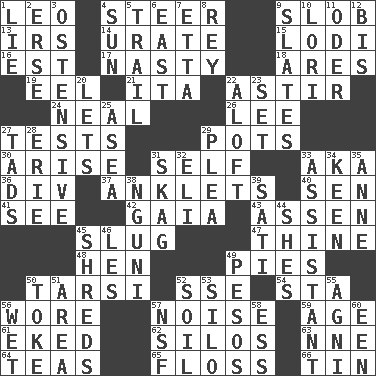 ACROSS 1. Lion 4. Guide 9. Messy guy 13. Big collection agency 14. A salt of uric acid 15. Farming town in central California 16. Eastern Standard Time (abbr.) 17. Difficult 18. Ancient Greek god of war 19. Snakelike fish 21. Call ___ day 22. Being in motion 24. Be tempered by heat 26. Area sheltered from the wind 27. Trials 29. Plant holders 30. Get up 31. Itself 33. Alias (abbr.) 36. HTML Container Element 37. Short socks 40. Elected rep. 41. Observe 42. Greek goddess of the earth (variant) 43. NE Netherlands city 45. Strike heavily 47. One or ones belonging to thee 48. Layer 49. Sliced desserts 50. Tarsus (plural) 52. Compass dir. 54. R.R. building 56. Had on 57. Annoying sound 59. Ripen 61. Made supply last 62. Grain storage towers 63. Compass dir. 64. Beverages made from leaves 65. Soft thread for cleaning between teeth 66. Shallow baking pan DOWN 1. Untruth 2. Celtic language 3. Clearly or manifestly demonstrative 4. Player for Phoenix 5. Lag or linger behind 6. 90 degrees 7. Singer James 8. Marina Del _, California 9. Chalkboards 10. Australian parrot (variant) 11. River in Europe 12. Twice 20. Allows 22. Upward 23. Arrange properly for use 25. Toward the sea 27. Small boys 28. One of the Great Lakes 29. Entreaty 31. Heroin 32. Connecticut Ivy Leaguer 33. Helper 34. Peachy ____! 35. Queen of England 1702-14 38. Group of southern Bantu languages 39. Suttee (variant) 44. "______ My Girl" (Turtles hit) 45. Tears up 46. French article 49. Mexican monetary units 50. Casino tip 51. Length times width 52. Land 53. Grain storage tower 55. Hindu god of fire 56. Soggy 57. Overdraft (abbr.) 58. Double-curved letter 60. Car or cant ending