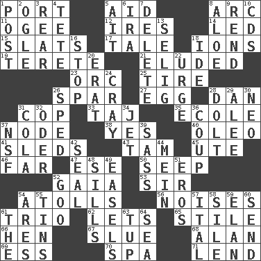 ACROSS 1. Left side of a ship or aircraft 5. Help 8. Curve 11. Double curve, resembling the letter S 12. Angers 14. Directed 15. Narrow boards 17. Falsehood 18. Charged atoms 19. Cylindrical with tapered ends 21. Dodged 23. The grampus (Milton) 25. Become fatigued 26. Coast Guard woman 27. Oval reproductive body of a fowl 28. One of the 12 tribes of Israel 31. Police officer (slang) 33. _ Mahal 35. Learning spot: Fr. 37. Connecting point 38. Consenting reply 40. Margarine 41. Bobsleighs 43. Scottish cap 45. Shoshoni 46. Distant 47. Compass dir. 50. Ooze 52. Greek goddess of the earth (variant) 53. Title for a knight 54. Ringlike coral islands and reefs 56. Annoying sounds 61. Musical group of three 62. Allows 65. Vertical member of a panel or frame 66. Layer 67. Change direction abruptly 68. ____ Jay Lerner 69. Curvy letter 70. Health resort 71. Grant temporary use of DOWN 1. Mail 2. Stare 3. Located in or toward the back 4. False hair 5. Small island 6. Lyricist Gershwin 7. Keyboard key 8. Medicinal plant 9. Tear apart 10. Music discs 13. Former Milwaukee Brewers owner Bud 16. Cease 18. Binary compound 20. Part of Q.E.F. 22. Goad 24. Supercomputer manufacturer 26. Moved rapidly 28. Dunce 29. Toward shelter 30. Modern: prefix 31. Root beer relative 32. River in Europe 34. _ stream 36. Clever action or accomplishment 37. Science/research agcy. 39. Backtalk 42. Lick closed 44. Count _ (2 wds.) 48. Beverly of Met fame 49. Artist's stands 51. Greek god of love 52. Thick or sticky substance 54. Ancient Greek god of war 55. Airtight sealed metal containers 57. Slanted text style (abbr.) 58. Filth; sediment 59. Flair 60. Transmit 61. Definite Article 63. Uncastrated adult male sheep 64. Ocean