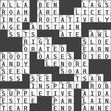 ACROSS 1. Silent film actress Nazimova 5. Benjamin's nick name 8. Straggles 12. Wander 13. "We ___ not amused" (Victoria) 14. It is permitted: Lat. 15. South American Indian 16. Producing rotation 19. Mature 20. Refrain by choice 21. Fast planes 23. Had dinner 24. Leather borer 27. Swiss mountan, "Queen of the Mountains" 30. A type of plum 31. Declaimed 34. Merit 35. Carrot, for example 38. Fertile tracts in a desert 40. Passed on 41. "60 Minutes" Commentator Rooney 42. Poe poem 44. Stitch closed the eyes of (a falcon) 45. Fly high 46. Curvy letter 47. Perceive with the eye 50. Russian ruler of old 53. Stimulate to action 57. Director Reiner 59. Supplementary 63. Opera by Verdi 64. First name in cosmetics 65. Baking dish 66. (Had) reclined 67. Pull apart 68. Conclusion 69. Queen of England 1702-14 DOWN 1. Roberta Peters solo 2. Yearns 3. Shoestrings 4. Nanny (var.) 5. Sharp remark 6. Greek god of love 7. Remaining after all deductions 8. 54 in ancient Rome 9. Adept person 10. Set 11. Filthy place 14. Actor's bit 17. American Automobile Association (abbr.) 18. Teat (slang) 20. SW Saudi Arabia district 22. TNT 24. Mountain range southwest of Kyrgyzstan 25. Had on 26. Grant temporary use of 28. E Mali city 29. Slanted text style (abbr.) 30. Spring feasts 32. Compass dir. 33. Hiding places for outlaws 35. To erase 36. Washington bills 37. Lyric poems 39. "Barney Miller" actor Jack 43. Assign a rank or rating to 47. Drop; flow; fall 48. Compass dir. 49. Eastern Standard Time (abbr.) 51. Believer in; advocate of (suffix) 52. "The Thinker" sculptor 54. Corncob 55. _ the terrible 56. Tear apart 58. Object of repulsion 59. Arrange properly for use 60. Purpose 61. Parent Teacher Assoc. 62. For each 63. Chicken ___ king