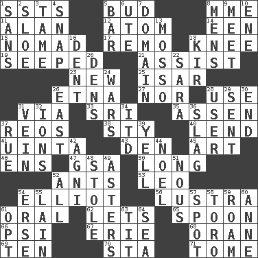 ACROSS 1. Fast planes 5. Partially opened flower 8. Madame (abbr.) 11. Actor Alda or Thicke 12. Tiny particle 14. Car or cant ending 15. Wanderer 17. San ____ (Riviera town) 18. Leg joint 19. Oozed 21. Aid 23. ___ Haven, CT 25. Austrian river, tributary to the Danube 26. Inactive volcano in Sicily 27. Not either 28. Purpose 31. By way of 33. _ Lanka 35. NE Netherlands city 37. Vintage cars 38. Filthy place 40. Grant temporary use of 41. National forest in Provo, Utah 43. Lair 45. Tate display 46. Followers of ems 47. Girls' org. (abbr.) 50. Protracted 52. Pismires 53. Lion 54. American author Paul (1891-1958) 56. A period of five years 61. Taken by mouth 62. Allows 65. Soup utensil 66. 23rd letter of the Greek alphabet 67. One of the Great Lakes 68. Northwest Algerian city 69. Nine, plus one 70. R.R. building 71. Heavy book DOWN 1. Without 2. A type of plum 3. Docile 4. Fastener 5. Long, evenly shaped piece 6. Shoshoni 7. Realm 8. Not women's 9. Rendezvous 10. Compass dir. 13. With motion or animation 16. Incision 18. Apertif with cassis 20. Cub Scout units 22. "Two Mules for Sister ____" 24. Armed conflicts 26. 90 degrees 28. One who uses or employs something 29. Transmitted 30. Conclude 31. Distinctive style or manner 32. Charged atoms 34. It would 36. Volcanic refuse 37. Sorrow 39. Shout 42. Hindu god of fire 44. Christmas carol 48. Took without asking 49. Michaelmas daisies 51. Good sense 52. 100% 54. Celtic language 55. (Had) reclined 57. Specific locale 58. "Corrida" creature 59. Wander 60. Singer Murray 61. Elect 63. Teat (slang) 64. Ocean