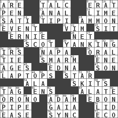 ACROSS 1. "We ___ not amused" (Victoria) 4. Baby powder 8. Part of Q.E.F. 12. Animal enclosure 13. Of or related to the anus 14. Welles in "The Third Man" 15. Suttee (variant) 17. Native american tent (variation) 18. ID or VA city 19. Happening 21. Zeal 23. Be seated 24. Bert's buddy 26. Fish or hair follower 28. Native of Scotland 30. Jerking 34. Big collection agency 37. California wine valley 39. Taken by mouth 40. Make a knot 41. Excessive but superficial compliments 43. Compass dir. 44. Grows older 46. Pulitzer Prize-winning author Ferber 47. Boy, to dad 48. Portable computers 51. Play the lead 54. According to 55. Burlesque acts 58. Label 61. Followers of ems 63. Having winglike extensions 65. U. of Maine site 67. First of billions? 71. Inky black, to poets 72. Corncob 73. Greek goddess of the earth (variant) 74. Flaplike covering 75. Comfort 76. Synchronize (abbr.) 77. Environmental prefix DOWN 1. Domed church section 2. Rob, plunder, or pillage 3. Keyboard key 4. Make lace 5. Black tropical American cuckoo 6. Infant locale 7. 154 in Roman numerals 8. Shade tree 9. Basketball hoops 10. Mine, in Marseilles 11. Portable shelter 16. Lodging establishments 18. So be it 20. Nervous spasm 22. _ tizzy (2 wds.) 25. Immeasurably long periods of time 27. Ring climax 29. Corrects by punishment or discipline 30. Entertaining tales 31. Angers 32. Billionth: prefix 33. Small, secluded valley 34. Slanted text style (abbr.) 35. Port city in Latvia 36. Ooze 38. Groovy apt. 42. Floor coverings 45. R.R. building 49. Butter sub 50. Baking dish 52. Alias (abbr.) 53. Cause heat under the collar 56. Eating place 57. Unemotional 58. Drink excessively 59. Operatic vocal solo 60. Republicans 62. Droops 64. Inside; within (prefix) 66. Born 68. 24 hours 69. The 18th letter of the Arabic alphabet 70. Apple computer (short form)