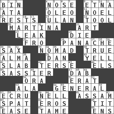ACROSS 1. Storage container 4. Olfactory organ 8. Inactive volcano in Sicily 12. _ moment's notice (2 wds.) 13. Margarine 14. Christmas carol 15. Musical pauses 18. ____ Bator 19. Implement 20. Chrissie's court nemesis 22. Nonscientific branch of learning 23. Path through which fluid escapes 24. Expire 25. Back 26. Flamboyance 30. Saxophone 33. Roamer 36. Loyal 37. _ mater 39. One of the 12 tribes of Israel 40. Shout 41. Broad, flat, thick piece 42. Laconic 44. Raised railways 45. More lively and spirited 47. Apply (a substance) by light strokes 50. Mouth or opening 51. Part of Q.E.F. 53. Wing 54. Commissioned military rank 57. Shade of tan 59. 1994 drama film starring Jodie Foster 61. Indian state 63. Petty quarrel 64. Greek god of love 65. Teat (slang) 66. Relaxation 67. Not wild 68. Followers of ems DOWN 1. Drinking establishment 2. Detail 3. Relating to the nose 4. Part of speech 5. Water jar 6. Ocean 7. Period of immesurable duration 8. Plea 9. A blast of a horn 10. Modern: prefix 11. 100% 16. Unclean, religiously 17. Play the lead 21. Visual representation of an object 22. The 18th letter of the Arabic alphabet 24. June honoree 26. Zero-star reviews 27. Algonquian 28. Frame or body of a ship 29. Snakelike fish 30. Backtalk 31. Silent film actress Nazimova 32. Dec. holiday 34. Baltic tributary 35. Make imperfect 38. Utter; complete 42. Beverage made from leaves 43. Genesis locale 46. Retirement account (abbr.) 48. Type of rug 49. Drinking establishments 52. Clothes sense 53. Caspian sea tributary 54. Take by theft 55. Otherwise 56. (Had) reclined 57. Compass dir. 58. Numbers guy (abbr.) 59. Fish or hair follower 60. Epoch 62. Mountains (abbr.)