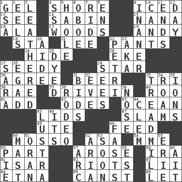 ACROSS 1. Set 4. Dinah or Pauly 9. On the rocks 13. Observe 14. Unit of acoustic absorption 15. Nanny 16. Insect wing 17. Forest 18. "60 Minutes" Commentator Rooney 19. R.R. building 21. Area sheltered from the wind 22. Leg coverings 24. Flintstone garb 26. Supplement with great effort 27. Sleazy 29. Play the lead 30. Match 31. Fermented drink made from hops 33. Three (prefix) 36. Actress Charlotte 37. Popular '50s hangout 40. Friend of Pooh 41. Say or write further 42. Lyric poems 43. Sea 45. Hats (slang) 47. Shuts with force 48. Shoshoni 49. Nourish 50. With motion or animation 52. White ___ sheet 54. Madame (abbr.) 56. Component 57. Came up 59. Lyricist Gershwin 61. Austrian river, tributary to the Danube 62. Disturbances 63. Cards in a Roman deck? 64. Inactive volcano in Sicily 65. 2nd pers. sing. pres. of can (arch.) 66. Allow DOWN 1. Girls' org. (abbr.) 2. Snakelike fish 3. Tough but pliablecoriaceous 4. Compass dir. 5. White Person, in Hawaii 6. Mitch Miller's instrument 7. Travel on or in a vehicle 8. Followers of ems 9. Sillier 10. Patter 11. Conclusions 12. 24 hours 20. Assistant 22. _ dish (used to culture cells) 23. Alias (abbr.) 25. Colored 27. "Two Mules for Sister ____" 28. Mild oath 29. Perceives with the eye 31. Auction offers 32. First lady 33. Excercise machine 34. Wander 35. Charged atoms 38. Cowboy competition 39. Olfactory organ 44. To starve (Brit.) 45. A period of five years 46. It is 49. Goes without food and/or water 50. Vertical spar for supporting sails 51. NW Algerian seaport 52. Operatic vocal solo 53. Within a short period 55. One of the Great Lakes 56. Sliced dessert 57. Curve 58. Eastern Standard Time (abbr.) 60. Small island