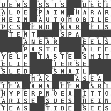 ACROSS 1. Hiding places for outlaws 5. Fast planes 9. Tenth: prefix 13. _ vera 14. Ache 15. Ethiopian city, capital of Harari 16. Count _ (2 wds.) 17. Car 19. Personal Computers (abbr.) 20. Conclude 21. Armed conflict 22. Raised railways 23. Portable shelter 25. Health resort 26. Approach 30. Snakelike fish 34. Thick mixture 35. Toward shelter 36. Sharp bark 39. Clothes sense 42. Stricken, poetically 43. Writer Wiesel 44. Laconic 46. Downhill vehicle 47. Slow-paced one 48. Apple computer (short form) 51. Toward the sea 54. Beverage made from leaves 57. Wet nurse (var.) 58. Opposite of masc. 60. Indian title of respect (Mr.) 62. Abnormally rapid or deep breathing 65. "Tell ____ the Marines!" 66. Originate 67. Takes to court 68. It's straight from the horse's mouth 69. Afternoon social gatherings 70. Periodic rise and fall of the sea level 71. Observes DOWN 1. Moist 2. Voters do this 3. Annoying sound 4. Elected rep. 5. Connect, as a bridge 6. Saudi Arabian king (1953-1964) 7. Teat (slang) 8. Frozen precipitation (plural) 9. Pat or tap gently 10. One of the Great Lakes 11. Give a ring to 12. Angers 15. Israeli folk dance 18. Atlas unit 20. Inactive volcano in Sicily 24. Slept 27. Eastern Standard Time (abbr.) 28. "One Day ___ Time" 29. Musical pauses 30. Artist's stands 31. Shade tree 32. Luau accessory 33. Arrange properly for use 36. Consenting reply 37. Pipe bend 38. Falsehood 40. Nine, plus one 41. Period 45. Thailand, formerly 48. Female horse 49. Electrical Unit 50. 2nd pers. sing. pres. of can (arch.) 52. First name in cosmetics 53. Nick name for Arthur 54. Not this but _ 55. Jane of fiction 56. Capital of Western Samoa 58. Nourish 59. Relaxation 61. Charged particles 63. Curvy letter 64. Fr. "Yes" 65. Big collection agency