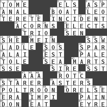 ACROSS 1. Heavy book 5. Raised railways 8. Viper 11. Of or related to the anus 12. Water vessel 13. Lion 14. Cigar-shaped 17. Event 19. Oak nuts 21. Opts 22. Musical group of three 23. Elected rep. 24. A female animal or person 27. Chow _ 29. Compass dir. 32. Dipping utensil 34. Mayday 36. Practice fight 37. Mountain range southwest of Kyrgyzstan 38. Eastern Standard Time (abbr.) 39. Diluted with white 40. Lacquered or enameled metalware 41. Ocean 42. Shops 43. Compass dir. 44. Beget 46. Fast jet (abbr.) 47. Auto club (abbr.) 50. College mil. group 52. A viewer who gazes fixedly 55. Michaelmas daisies 57. Characterized by complete cowardliness 59. Threatening words 62. Period 63. Body of Kaffir warriors 64. Ache 65. Spanish title 66. Ingest 67. Jane of fiction DOWN 1. Make lace 2. Single 3. Hindu Mythology: god of death 4. Voters do this 5. Age 6. Shoestrings 7. Vertical member of a panel or frame 8. Actor Baldwin 9. Posted 10. Cooking vessels 12. Again 15. Singer Mel 16. 4th largest of the Great Lakes 18. Lair 20. Annoying sounds 24. Narrow boards 25. Rings 26. Peak District village in England 28. Olfactory organs 29. Practice fights 30. Table seasonings 31. Obtain by seizing forcibly or violently 33. Whopper 35. Flight of steps 36. Health resort 42. Distance measurement 45. Printing process, for short 47. Nonscientific branch of learning 48. Nest on high 49. Odor 51. Streamer paper 52. Moved rapidly 53. "Corrida" creature 54. ____ Jay Lerner 55. Black tropical American cuckoo 56. Kill 58. Elect 60. Title for a knight 61. Compass dir.