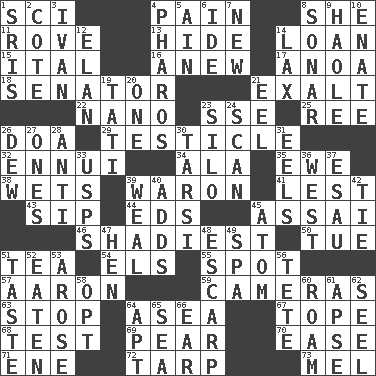 ACROSS 1. _-fi 4. Ache 8. A female animal or person 11. Be footloose 13. Flintstone garb 14. Grant temporary use of 15. Slanted text style (abbr.) 16. Afresh 17. Small Philippine buffalo 18. Elected representative 21. Glorify 22. Billionth: prefix 23. Compass dir. 25. To sift 26. ___ good deed 29. One of the two male reproductive glands 32. World-weariness 34. In the manner of 35. She-sheep 38. Soaks 39. Make _____ (do battle with) 41. For fear that 43. Small drink 44. Begley and Asner 45. Slender Brazilian palm 46. Most dark, concealed or hidden 50. Third day of the wk. 51. Afternoon social gathering 54. Raised railways 55. Specific locale 57. Composer Copland 59. Devices for capturing images 63. Halt 64. At sea 67. Drink excessively 68. Trial 69. Lightbulb-shaped fruit 70. Relaxation 71. Compass dir. 72. Canvas cover 73. Cartoonist voice _ Blanc DOWN 1. Indian titles of respect 2. ____ d'Azur (French Riviera) 3. _ the terrible 4. N Egypt peninsula 5. The 18th letter of the Arabic alphabet 6. Binary compound 7. ___ Haven, CT 8. Echolocation 9. White Person, in Hawaii 10. Maternal 12. Liveliness 14. Not strict 19. Jacques of French films 20. Single 21. Snakelike fish 23. Grain storage tower 24. Skim 26. Morning condensation 27. Singles 28. Opposed to 30. Tarsus (plural) 31. Snakelike fish 33. United States Postal Service (abbr.) 36. Compass direction 37. Son of Isaac 39. Welt 40. Does sums 42. Neckwear 45. Smallest unit of an element 47. Layer 48. Fortification 49. Health resort 51. Clothes sense 52. Consumed 53. Came up 56. False hair 58. Choose 60. Wander aimlessly 61. Domed church section 62. Stitch closed the eyes of (a falcon) 64. Fitting 65. Ocean 66. Hearing organ