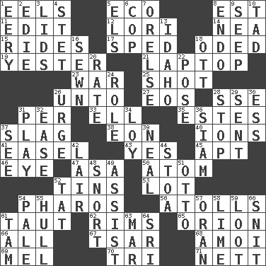 ACROSS 1. Snakelike fish 5. Environmental prefix 8. Eastern Standard Time (abbr.) 11. Prepare for publication 12. Australian parrot (variant) 14. Teachers' org. 15. Amusement-park features 17. Moved rapidly 18. Wrote a lyric poem 19. Last 21. Portable computer 23. Armed conflict 25. Went for two points 26. To (old English) 27. Greek goddess of the dawn 28. Compass dir. 31. For each 33. Pipe bend 35. _____ Park, CO 37. Volcanic refuse 38. Age 40. Charged atoms 41. Artist's stand 43. Affirmative reply 45. Fitting 46. Sight organ 47. White ___ sheet 50. Tiny particle 52. Metal containers 53. Car dealer's back yard 54. N Egypt peninsula 56. Ringlike coral islands and reefs 61. Pulled tight 62. Basketball hoops 65. Constellation of myth 66. 100% 67. Russian ruler of old 68. Mine, in Marseilles 69. Cartoonist voice _ Blanc 70. Three (prefix) 71. Remaining after all deductions DOWN 1. Suggestive of the supernatural 2. Singer Brickell 3. Flaplike coverings 4. Proofreading order 5. Raised railways 6. Police officer (slang) 7. Threatening words 8. Inside; within (prefix) 9. Ooze 10. Bit 13. Potato state 16. Stitched 18. Baseball player Mel 20. Pace 22. Introduce or present, as a question 24. Hero or heavy, e.g. 26. Goad 28. Halt 29. Posted 30. Curvy letter 31. Shaw product 32. Relaxation 34. Myrna of the movies 36. Thailand, formerly 37. Observe 39. Be tempered by heat 42. Den 44. Portico 48. Derisive sound 49. Help 51. "Beetle Bailey" pooch 52. Make lace 54. Diluted with white 55. Frame or body of a ship 57. Northwest Algerian city 58. Welles in "The Third Man" 59. Plunder 60. In a ____ (agitated or irritated) 61. Scottish cap 63. Make imperfect 64. _ Lanka