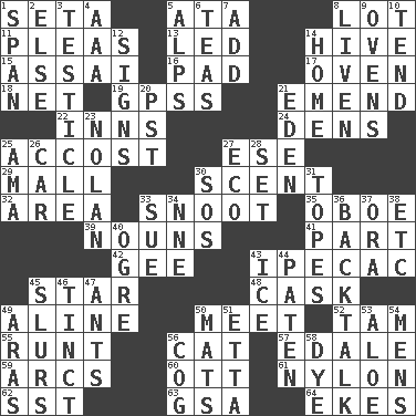 ACROSS 1. Bristle 5. _ moment's notice (2 wds.) 8. Car dealer's back yard 11. Entreaties 13. Directed 14. Hub of activity 15. Slender Brazilian palm 16. Writing tablet 17. Baking chamber 18. Fish or hair follower 19. Global Positioning Systems (abbr.) 21. Make improvements or corrections to 22. Restaurants 24. Lairs 25. Buttonhole 27. Compass dir. 29. Shopping center 30. Aroma 32. Type of rug 33. Snob 35. Mitch Miller's instrument 39. Parts of speech 41. Piece 42. Turn to the right 43. Medicinal drug used to evoke vomiting 45. Play the lead 48. Keg 49. Place in a line 50. Confront 52. Scottish cap 55. The smallest animal of a litter 56. Feline 57. Peak District village in England 59. Curves 60. Baseball player Mel 61. Thermoplastic polyamide 62. Fast jet (abbr.) 63. Girls' org. (abbr.) 64. Supplements with great effort DOWN 1. Connect, as a bridge 2. Otherwise 3. A testis 4. American Automobile Association (abbr.) 5. High mountains 6. Beverages made from leaves 7. Increase 8. Make or become more lively 9. Baking chambers 10. Look after 12. Attaches a signature 14. Residence 20. Pacific Standard Time (abbr.) 21. Genesis locale 23. Pitcher Ryan 25. Wet nurse (var.) 26. 4-wheeled motor vehicle 27. Environmental prefix 28. Arrange properly for use 30. Mayday 31. Drinks excessively 33. Institute legal proceedings 34. Compass dir. 36. Sass 37. Mouth or opening 38. And so on (abbr.) 40. Legendary monster 43. Frozen water 44. Eucharist need 45. Plays smoothly or legato 46. Tinged 47. Pismires 49. Caspian sea tributary 50. Floor protectors 51. Singer James 53. Medicinal plant 54. Not women's 56. Gear tooth 58. Color