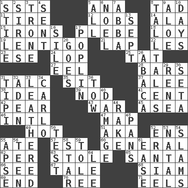 ACROSS 1. Fast planes 5. Santa ___, CA 8. Small amount or degree 11. Hoop that covers a wheel 12. Tennis shots 14. Chicken ___ king 15. Metal shackles 17. Military trainee 18. Myrna of the movies 19. Small, flat, pigmented spot on the skin 21. Pet locale 22. French article 23. Compass dir. 24. Trim (branches) 25. Make lace 27. Snakelike fish 28. Oblong pieces of solid material 31. Baby powder 35. Be seated 37. Toward shelter 38. The content of cognition 39. Allow head to fall sleepily 41. Penny 42. Lightbulb-shaped fruit 43. Armed conflict 45. At sea 46. International (abbr.) 47. Atlas unit 49. Being at a high temperature 51. Alias (abbr.) 52. Followers of ems 55. Had dinner 57. Eastern Standard Time (abbr.) 60. Commissioned military rank 62. For each 63. Fur scarf 65. Before Barbara or Clara 66. Observe 67. Story 68. Thailand, formerly 69. Conclude 70. To sift 71. Snakelike fish DOWN 1. Vertical member of a panel or frame 2. Titles for men of rank and authority 3. Marketplace scale 4. Posted 5. 100% 6. Christmas carol 7. Swedish rock group 8. Baron Munchausen's specialties 9. _ vera 10. 24-hour periods 13. Back-to-school mo. 16. Drop; flow; fall 17. Cotton for raincoats, e.g. 20. Leaves 26. Phillipine bananalike plant 29. French philosopher Descartes 30. Stalk of a moss capsule 31. Native american tent (variation) 32. Arabian gulf 33. Resembling or made to resemble leather 34. Monte _, Las Vegas Hotel/Casino 36. Pull behind 40. Break 44. Immoral or dissolute person 48. Zero-star reviews 50. Trial 52. Bert's buddy 53. Brizilian seaport 54. Hits or strikes with great force 55. Domed church section 56. Adolescent 58. Play the lead 59. Lacquered or enameled metalware 61. Relaxation 64. Area sheltered from the wind