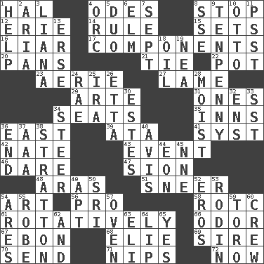 ACROSS 1. Actor Linden 4. Lyric poems 8. Close up, plug up 12. One of the Great Lakes 14. Court order 15. Arranges properly for use 16. One who doesn't tell the truth 17. Parts 20. Baking dishes 21. Neckwear 22. Plant holder 23. Nest on high 27. Unable to walk 29. Johnson of "Laugh-In" 31. Washington bills 34. Theater features 35. Lodging establishments 36. 90 degrees 39. _ moment's notice (2 wds.) 41. System (abbr.) 42. Nathan's nickname 43. Incident 46. Have the gumption 47. The Jewish people; Israel 48. Caspian sea tributary 51. Contemptuous expression 54. Tate display 56. Adept person 58. College mil. group 61. Producing rotation 66. Scent 67. Inky black, to poets 68. Writer Wiesel 69. Male parent of an animal 70. Post 71. Pinches, bites 72. At this time DOWN 1. Aid 2. Roberta Peters solo 3. Climbing, woody, usually tropical vines 4. The grampus (Milton) 5. Superhero pair 6. Shade tree 7. Back-to-school mo. 8. Compass dir. 9. 3-inch nail 10. Von Bismarck 11. Inconspicuous attention getter 13. Celtic language 18. Lubricate 19. Teachers' org. 24. Actress Charlotte 25. Retirement account (abbr.) 26. Singer James 28. Damp 30. _____ Park, CO 32. Followers of ems 33. Fast jet (abbr.) 34. Guide 36. Conclusion 37. American Automobile Association (abbr.) 38. Ski resort town in Vermont 40. Advice 44. Period of immesurable duration 45. Compass dir. 49. Fitting 50. _ Lanka 52. Greek god of love 53. "The Thinker" sculptor 54. Ancient Greek god of war 55. Loose flowing garment 57. Baking chamber 59. "Corrida" creature 60. Ship's personnel 62. Plus 63. Connecticut Ivy Leaguer 64. Mouth edge 65. It is so