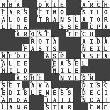ACROSS 1. Basketball assoc. 4. Migrant worker of the '30s 8. Bowlike part 12. Hearing organs 14. Fine (Spanish) 15. Grain storage tower 16. _ vera 17. Interpreter 20. Pale green bean 21. Compass dir. 22. Accounting whiz (abbr.) 23. Came up 27. Technician 29. Roll call or roster of names 31. Opera by Verdi 34. Goes without food and/or water 35. Famous astronaut Armstrong 36. Ancient Persian 39. Cleo's killer 41. At sea 42. Toward shelter 43. Artist's stand 46. Uncontrolled 47. Mediterranean tributary 48. American tennis player Robert 51. Thermoplastic polyamide 54. Put into a specified state 56. Actress Gardner 58. Flat circle 61. The property of being fit to eat 66. Tenth: prefix 67. Small Philippine buffalo 68. Jacques of French films 69. Leave at once 70. Long (Scottish) 71. Play the lead 72. Compass dir. DOWN 1. Be tempered by heat 2. Indonesian resort city 3. Scent 4. Often (poetically) 5. Apertif with cassis 6. _ tizzy (2 wds.) 7. Immeasurably long periods of time 8. White ___ sheet 9. Actors Guy, Robert Welles, and Clint 10. Hoof sound 11. Israeli folk dance 13. Shrivel 18. Fast jet (abbr.) 19. Area sheltered from the wind 24. Mouth or opening 25. Distress signal 26. Singer James 28. Lessep's creation 30. NE Netherlands city 32. Expire 33. Insect wing 34. Eats 36. Informal term for the mouth 37. Biblical high priest 38. Accusation by an informer 40. Ache 44. Stealthy 45. Snakelike fish 49. Actor Linden 50. First lady 52. Probability 53. Sibling's daughter 54. Lick closed 55. Pulitzer Prize-winning author Ferber 57. Pismires 59. Glance over 60. Quote 62. Paper or plastic container 63. Erode 64. R.R. building 65. Title for a knight