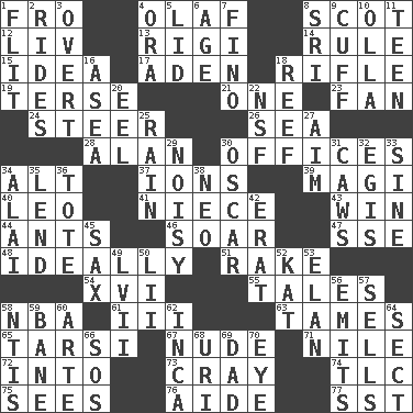 ACROSS 1. Away 4. Norwegian king 8. Highlander 12. 54 in ancient Rome 13. Swiss mountan, "Queen of the Mountains" 14. Governing power 15. The content of cognition 17. Arabian gulf 18. Firearm 19. Laconic 21. Single 23. Air blower 24. Guide 26. Ocean 28. ____ Jay Lerner 30. Places of business 34. Keyboard modifier key 37. Charged atoms 39. Wise men 40. Lion 41. Sibling's daughter 43. Acquire through effort 44. Pismires 46. Fly high 47. Compass dir. 48. Under perfect conditions 51. Libertine 54. 16 55. Falsehoods 58. Basketball assoc. 61. One more than two 63. Makes less strong or intense 65. Tarsus (plural) 67. Unadorned 71. The longest river in the world 72. To the inside or interior of 73. Supercomputer manufacturer 74. Affectionate concern, for short 75. Perceives with the eye 76. Assistant 77. Fast jet (abbr.) DOWN 1. Secret move to avoid paying debts 2. Amusement-park features 3. Unconcealed 4. Mouth or opening 5. Flaplike covering 6. Personal question 7. A pale, very dry sherry 8. Indian title of respect (Mr.) 9. Sleeve end 10. Rounded earthenware pot or jar 11. Adolescent 16. Toward the sea 18. Coral ridge 20. Snakelike fish 22. Overdraft (abbr.) 25. Water falling in drops from the sky 27. Direct toward a target or goal 29. Annoyingly loud 30. Motion picture award 31. Crow sounds 32. Armor plate that protects the chest 33. Trig term 34. Jai _ 35. Grant temporary use of 36. Lug 38. Modern: prefix 42. Part of Q.E.F. 45. Saxophone 49. 57 in ancient Rome 50. Cards in a Roman deck? 52. Krazy ___ of comics 53. Liveliness 56. Gives off 57. Makes a sale 58. Nuclear Threat Initiatives 59. Object of repulsion 60. Johnson of "Laugh-In" 62. South American Indian 64. Religious group 66. Distress signal 68. RI univ. 69. June honoree 70. Sight organ
