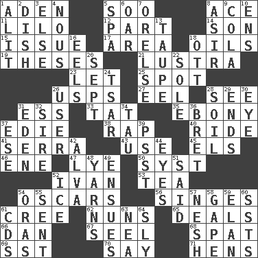 ACROSS 1. An important port of Yemen 5. "Barney Miller" actor Jack 8. Adept person 11. _ and Stitch 12. Role in a play 14. Male child 15. Come out of 17. Type of rug 18. Petroleums 19. College papers 21. A period of five years 23. Allow 25. Blemish 26. United States Postal Service (abbr.) 27. Snakelike fish 28. Observe 31. Curvy letter 33. Make lace 35. Dark wood 37. Singer Brickell 38. Strike 40. Travel on an animal 41. Father Junipero _ 43. Purpose 45. Raised railways 46. Compass dir. 47. Potassium hydroxide 50. System (abbr.) 52. "Terrible" tsar 53. Afternoon social gathering 54. Motion picture awards 56. Burns superficially 61. Algonquian 62. Religious women 65. Allots cards 66. One of the 12 tribes of Israel 67. Stitch closed the eyes of (a falcon) 68. Argument over a trivial matter 69. Fast jet (abbr.) 70. Declare 71. Coop moms DOWN 1. Came down and settled, as after flight 2. Food container 3. Otherwise 4. Good sense 5. Health resort 6. Rowing implement 7. Threatening words 8. SW Saudi Arabia district 9. Root beer relative 10. Followers of ems 13. Grayish beige 16. Snakelike fish 18. Baseball player Mel 20. Back-to-school mo. 22. Flatfish 24. Russian ruler of old 26. One who makes use of a thing 28. Land 29. Extremities 30. Sight organ 31. Locale of original sin 32. Male parent of an animal 34. The 19th letter of the Greek alphabet 36. Cy Young winner Saberhagen 37. Compass dir. 39. Inconspicuous attention getter 42. Inventor's middle name 44. Sight organs 48. Entertaining tales 49. Takes place subsequently 51. Alleged 52. Frozen water 54. Mouths or openings 55. Transmitted 57. Tender 58. Stare wonderingly 59. Style 60. Fast planes 61. Music discs 63. Teachers' org. 64. Secret