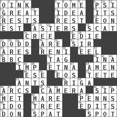 ACROSS 1. Pig sound 5. Heavy book 9. 23rd letter of the Greek alphabet 12. Relatively large 14. It may be bright or harebrained 15. It is 16. Musical pauses 17. State of inaction 18. A really long time 19. Eastern Standard Time (abbr.) 20. Michaelmas daisies 23. Leave at once 24. Algonquian 25. Singer Brickell 27. Texas town _ City 30. "We ___ not amused" (Victoria) 32. Title for a knight 33. Ancient Greek god of war 34. Painter Guido (1575-1642) 36. Snakelike fish 38. English channel? 39. Label 40. _ tizzy (2 wds.) 43. Mischievous child 46. Inactive volcano in Sicily 48. So be it 49. Compass dir. 51. Greek goddess of the dawn 52. False hair 53. Pismires 54. Port city in Latvia 56. Arches 58. Device for capturing images 61. Small drink 64. Was introduced to 65. Female horse 66. Actor Sean's family 68. Wedding promise 69. Woody plant 70. Prepares for publication 71. Spanish title 72. Petty quarrel 73. Specific locale DOWN 1. Legendary monster 2. Angers 3. Egg locale 4. Krazy ___ of comics 5. Hoop that covers a wheel 6. River in Europe 7. Makes clutter 8. Consume 9. Component 10. Portico 11. Is not 13. Russian ruler of old 21. Dry up 22. Cigar-shaped 23. Title for a man of rank and authority 24. Music discs 26. Expire 27. Apply (a substance) by light strokes 28. Globe 29. Tenth: prefix 31. Related on the mother's side 35. Dismiss 37. Welles in "The Third Man" 41. Fish or hair follower 42. One (Scot) 44. Not women's 45. Pacific Standard Time (abbr.) 47. SW Saudi Arabia district 48. "One Day ___ Time" 50. Fortification 53. 13-14th century defensive garment 55. Yawn 56. Among 57. Redecorate 59. Length times width 60. Rendezvous 61. Sever or remove by pinching or nipping 62. To the inside or interior of 63. Inconspicuous attention getter 65. Mountains (abbr.) 67. Begley and Asner