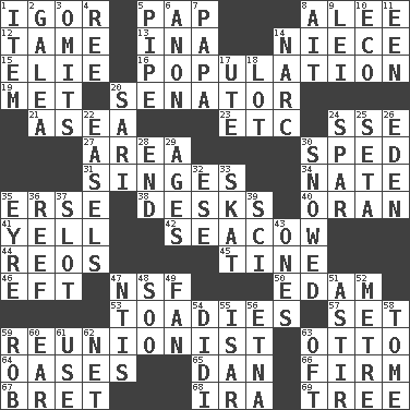 ACROSS 1. Composer Stravinsky 5. Infant food 8. Toward shelter 12. Not wild 13. _ tizzy (2 wds.) 14. Sibling's daughter 15. Writer Wiesel 16. Census information 19. Was introduced to 20. Elected representative 21. At sea 23. And so on (abbr.) 24. Compass dir. 27. Length times width 30. Moved rapidly 31. Scorches 34. Nathan's nickname 35. Celtic language 38. Writing tables 40. Northwest Algerian city 41. Shout 42. Manatee 44. Vintage cars 45. Prong on a fork 46. Newt 47. Overdraft (abbr.) 50. Dutch treat 53. Sycophants 57. Put into a specified state 59. One who advocates reunion 63. "Beetle Bailey" pooch 64. Fertile tracts in a desert 65. One of the 12 tribes of Israel 66. Securely fixed in place 67. Cy Young winner Saberhagen 68. Lyricist Gershwin 69. Family _ (genealogy) DOWN 1. A whole individual unit 2. An organ shaped like a helmet 3. Leaves out 4. To riddle 5. Corncob 6. Soon (poet.) 7. Dad 8. Small island 9. Flowery wreath 10. Environmental prefix 11. Car or cant ending 14. Drug cop 17. Shoshoni 18. Car dealer's back yard 20. Indian skirt 22. Artist's stands 24. Practice fight 25. Bristle 26. Genesis locale 28. Conclusion 29. Eons 30. Frozen precipiation fell 32. Compass dir. 33. Three-handed card game 35. Jane of fiction 36. Coral ridge 37. Narrow opening 39. _-fi 43. Washington bills 47. Nuclear Threat Initiatives 48. "Barney Miller" actor Jack 49. Avid follower 51. Having gotten out of bed 52. Distance measurement (Brit.) 54. "You Light Up My Life" star Conn 55. Austrian river, tributary to the Danube 56. Inactive volcano in Sicily 58. Heavy book 59. Director Reiner 60. Hearing organ 61. Purpose 62. Fish or hair follower 63. Often (poetically)