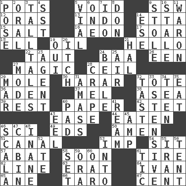 ACROSS 1. Cooking vessels 5. Empty area or space 9. Compass dir. 12. Mouths or openings 13. _ china 14. Singer James 15. Table seasoning 16. Age 17. Fly high 18. Pipe bend 19. Petroleum 21. Phone greeting 22. Pulled tight 24. Sound made by sheep 26. Car or cant ending 27. Mysterious quality of enchantment 28. To provide with a ceiling 29. Undercover agent 30. Ethiopian city, capital of Harari 32. Lug 36. Arabian gulf 37. Cartoonist voice _ Blanc 38. Toward the sea 39. State of inaction 40. Some stationery 42. Proofreading order 43. Comfort 44. Ingested 46. _-fi 49. Begley and Asner 50. So be it 51. Lessep's creation 53. Naughty child 54. Be seated 57. Blind as ____ 58. Within a short period 61. Hoop that covers a wheel 62. Actor's bit 63. Part of Q.E.F. 64. "Terrible" tsar 65. One (Scot) 66. Pacific island yam 67. Penny DOWN 1. Airs 2. Spoken 3. Baron Munchausen's specialties 4. Fast jet (abbr.) 5. Small bottle 6. Single 7. Wedding promise 8. Spanish title 9. Fur scarf 10. Having lost freshness 11. Make _____ (do battle with) 14. Compass dir. 19. Fr. "Yes" 20. Hankering 21. Actor Linden 23. Representative 24. Memphis, Tenn. Street 25. Wind 27. Method 28. Streamer paper 29. Spoil 31. Collect or gather 32. Clothes sense 33. Clearly or manifestly demonstrative 34. Adolescent 35. Erode 40. Writing tablet 41. 480, 500 or 516 sheets of paper 43. Snakelike fish 45. Electrical Unit 46. Any of the three canals of the cochlea 47. Small house or cottage 48. Empty; void 52. Had dinner 53. To the inside or interior of 55. SW Asia republic 56. Portable shelter 58. Put into a specified state 59. Mouth or opening 60. Rowing implement 61. Nervous spasm