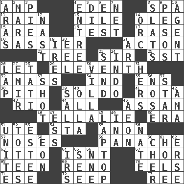 ACROSS 1. Electrical Unit 4. Paradise 8. Health resort 11. Water falling in drops from the sky 13. The longest river in the world 14. Cassini of fashion 15. Length times width 16. Trial 17. To erase 18. More disrespectful 21. Gambison 22. Woody plant 23. Title for a knight 25. Fast jet (abbr.) 26. Allow 29. Veterans Day date 32. Collect or gather 34. Working for oneself (abbr.) 35. Followers of ems 38. Heart or essence 39. Twentieth part of a lira 41. Roll call or roster of names 43. _ de Janeiro 44. 100% 45. Indian state 46. Copy Pinocchio 50. Epoch 51. Shoshoni 54. R.R. building 55. Soon (poet.) 57. Olfactory organs 59. Flamboyance 63. "Tell ____ the Marines!" 64. Is not 67. Son of Odin 68. Adolescent 69. Former U.S. Attorney General Janet 70. Snakelike fish 71. Compass dir. 72. Ooze 73. To separate or throw off DOWN 1. Ancient river in northeast Turkey 2. Hindu Mythology: god of death 3. Sliced desserts 4. Main course 5. Expire 6. Raised railways 7. Fish or hair follower 8. Narrow boards 9. Mexican monetary units 10. Representative 12. Political cartoonist Thomas 14. The grampus (Milton) 19. Angers 20. Snakelike fish 21. Nonscientific branch of learning 23. Transmit 24. Southeast Asian peninsula 26. Infant locale 27. Arab leader 28. Jacques of French films 30. Country residence 31. Possessive pronoun 33. Went for two points 36. Characteristic smell of wine 37. Play the lead 39. Table seasoning 40. Rounded earthenware pot or jar 42. Nursemaid (var.) 45. Age 47. Double-curved letter 48. Portable computer 49. _ tizzy (2 wds.) 51. Join together 52. Hauls 53. First name in cosmetics 56. Nathan's nickname 58. Period of immesurable duration 60. "Mermaids" star 61. Hollow 62. Celtic language 64. Big collection agency 65. Observe 66. Compass dir.