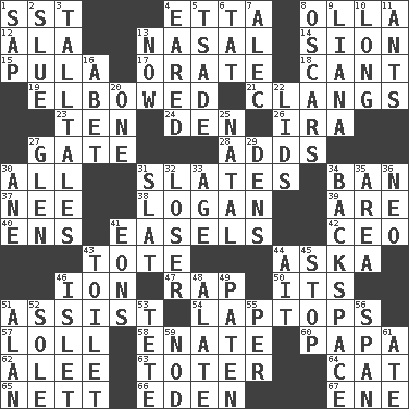 ACROSS 1. Fast jet (abbr.) 4. Singer James 8. Spanish pot 12. Insect wing 13. Relating to the nose 14. The Jewish people; Israel 15. Monetary unit of Botswana 17. Speak pompously 18. Patter 19. Shoved, as through a crowd 21. Rings like a ship's bell 23. Nine, plus one 24. Lair 26. Lyricist Gershwin 27. Yard entry 28. Sums up 30. Everything 31. Chalkboards 34. Forbid 37. Born 38. Utah city north of Ogden 39. "We ___ not amused" (Victoria) 40. Followers of ems 41. Artist's stands 42. Corporate head (abbr.) 43. Carryall 44. "____ silly question..." 46. Electrically charged atom 47. Hit sharply and swiftly 50. ___ a Wonderful Life 51. Help 54. Portable computers 57. Hang loosely or laxly 58. Related on the mother's side 60. Dad 62. Toward shelter 63. Carrier 64. Feline 65. Remaining after all deductions 66. Paradise 67. Compass dir. DOWN 1. Plant excrement 2. Change direction abruptly 3. Baron Munchausen's specialties 4. Having ears or earlike features 5. Sadhe (variant) 6. Make lace 7. Actor Baldwin 8. Motion picture awards 9. Woody, climbing, usually tropical plant 10. Yearn 11. Pismires 13. Immediately 16. Collude with 20. Single 22. Flaplike coverings 25. Relating to or accompanying birth 27. Small, secluded valley 29. Cub Scout units 30. One (Scot) 31. Narrow board 32. Failure 33. Ripen 34. Keyboard key 35. Type of rug 36. Modern: prefix 41. Immeasurably long periods of time 43. Bathroom 44. Small island 45. Cease 46. Small island 48. Having winglike extensions 49. Eucharist need 51. ____ Jay Lerner 52. Flatfish 53. Wig 55. For each 56. Connect, as a bridge 59. Dreamland 61. Had dinner