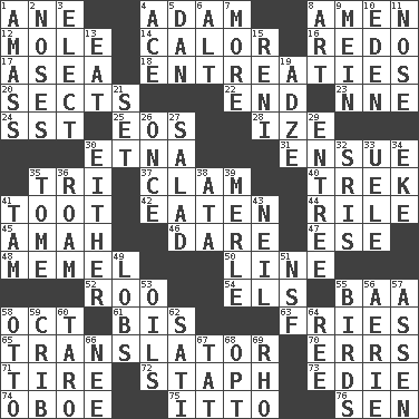 ACROSS 1. A saturated hydrocarbon 4. First man 8. So be it 12. Undercover agent 14. Bodily heat indicating an inflammation 16. Make new 17. At sea 18. Pleas 20. Religious groups 22. Conclusion 23. Compass dir. 24. Fast jet (abbr.) 25. Greek goddess of the dawn 28. Ending with capital 30. Inactive volcano in Sicily 31. Take place subsequently 35. Three (prefix) 37. Dollar (slang) 40. Long journey 41. A blast of a horn 42. Eroded 44. Cause heat under the collar 45. Nanny 46. Have the gumption 47. Compass dir. 48. Klaipeda city 50. Actor's bit 52. Friend of Pooh 54. Raised railways 55. Sound made by sheep 58. Sep. follower 61. Altar cloth linen 63. Strips of potato fried in deep fat 65. Interpreter 70. Blunders 71. Become fatigued 72. Staphylococcus 73. Singer Brickell 74. Mitch Miller's instrument 75. "Tell ____ the Marines!" 76. Elected rep. DOWN 1. Collect or gather 2. Olfactory organs 3. Opt 4. Adept person 5. Daniel's nick name 6. The first octave above the treble staff 7. Greater amount 8. Tate display 9. Chow _ 10. Genesis locale 11. Sense of smell 13. Ingest 15. Painter Guido (1575-1642) 19. Edge tool used to cut and shape wood 21. Put into a specified state 26. Single time 27. First course 29. Main course 30. One or the other 32. Indian titles of respect 33. Ubangi River tributary 34. Make supply last 35. Heavy book 36. Wander aimlessly 38. "One Day ___ Time" 39. Haggard of country music 41. Scottish cap 43. Famous astronaut Armstrong 49. Tennis shots 51. Overdraft (abbr.) 53. Petroleums 55. Avian creatures 56. Nest on high 57. NE Netherlands city 58. "Beetle Bailey" pooch 59. Baby bed with high sides 60. Edible starchy tuberous root 62. Suttee (variant) 64. To separate or throw off 66. Born 67. Make lace 68. Choose 69. 17th letter of the Greek alphabet