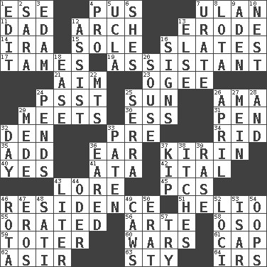 ACROSS 1. Compass dir. 4. Festering 7. ____ Bator 11. June honoree 12. Bowlike part 13. Eat (away) 14. Retirement account (abbr.) 15. Not divided or shared with others 16. Chalkboards 17. Makes less strong or intense 19. Helper 21. Direct toward a target or goal 23. Double curve, resembling the letter S 24. Inconspicuous attention getter 25. Player for Phoenix 26. Nanny (var.) 29. Confronts 30. Double-curved letter 31. Writing instrument 32. Lair 33. Before (prefix) 34. To free from 35. Increase 36. Ewer handle 37. Japanese brewing company 40. Affirmative reply 41. "One Day ___ Time" 42. Slanted text style (abbr.) 43. Old wives' tales, e.g. 45. Personal Computers (abbr.) 46. Home 51. Sun: prefix 55. Declaimed 56. Johnson of "Laugh-In" 58. Bear (Spanish) 59. Carrier 60. Armed conflicts 61. Head covering 62. SW Saudi Arabia district 63. Filthy place 64. Big collection agency DOWN 1. Prepare for publication 2. "Two Mules for Sister ____" 3. Dutch treat 4. Adept person 5. Southern CA. univ. 6. "______ My Girl" (Turtles hit) 7. A salt of uric acid 8. Globular water bottle used in Asia 9. An important port of Yemen 10. A home for chicks 12. Aid 13. Otherwise 16. Public displays of written messages 18. Comfort 20. Boozer 22. Mountains (abbr.) 24. Depends 25. Father Junipero _ 26. Showery time 27. Count _ (2 wds.) 28. Plus 29. Ancient Persian 32. 24 hours 33. Eucharist need 36. Having ears or earlike features 37. Sleep 38. Skin irritations 39. Raze (variant) 43. 61 cubic inches 44. River in Europe 46. Round or rotation of duties 47. Greek god of love 48. Suttee (variant) 49. Crow sounds 50. Part of Q.E.F. 52. Venues 53. Austrian river, tributary to the Danube 54. I made a mistake 57. Attempt to accomplish something