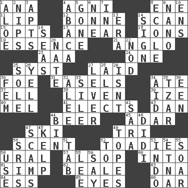 ACROSS 1. Santa ___, CA 4. Hindu god of fire 8. Compass dir. 11. Mouth edge 12. Child's nurse 14. Glance over 15. Elects 17. Approach 18. Charged atoms 19. Core 21. White American of non-Hispanic descent 23. Auto club (abbr.) 24. Single 25. System (abbr.) 27. Put down 30. Enemy 31. Artist's stands 34. Had dinner 37. Pipe bend 38. Make or become more lively 39. Ending with capital 40. Cartoonist voice _ Blanc 41. Chooses 43. One of the 12 tribes of Israel 44. Fermented drink made from hops 45. The sixth month of the Jewish calendar 47. What Jean-Claude Killy likes to do 49. Three (prefix) 50. Odor 52. Sycophants 56. Mountain range 57. Columnist Joseph or Stewart 60. To the inside or interior of 61. Simple or foolish person 62. Calif. Air Force Base 63. Heredity factor (abbr.) 64. Double-curved letter 65. Sight organs 66. Boat paddle DOWN 1. _ vera 2. Cuts off 3. Flats, for short 4. Phillipine bananalike plant 5. Went 6. Compass dir. 7. _ tizzy (2 wds.) 8. Learning spot: Fr. 9. Billionth: prefix 10. Followers of ems 13. Epoch 14. Signal 16. Oceans 20. Nathan's nickname 22. Allow head to fall sleepily 25. Flatfish 26. Shout 27. Crowbar 28. Actor Baldwin 29. Is not 30. Opposite of masc. 32. Toward shelter 33. Drop; flow; fall 34. Opera by Verdi 35. Russian ruler 36. Car or cant ending 42. "Two Mules for Sister ____" 44. Storage container 46. "You Light Up My Life" star Conn 47. Fraudulent business schemes 48. Seaweed 49. Drinks excessively 50. Indian titles of respect 51. Keyboard key 52. Lacquered or enameled metalware 53. Southeast Asian peninsula 54. Inactive volcano in Sicily 55. Fly high 56. Purpose 58. Area sheltered from the wind 59. Declare