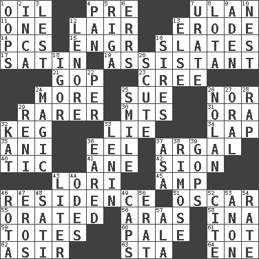 ACROSS 1. Lubricate 4. Before (prefix) 7. Uhlan (variant) 11. Single 12. Den 13. Eat (away) 14. Personal Computers (abbr.) 15. Engineer (abbr.) 16. Chalkboards 17. Smooth fabric 19. Helper 21. Republican Party 23. Algonquian 24. Greater amount 25. Take to court 26. Or not 29. Less widely known 30. Mountains (abbr.) 31. Mouth or opening 32. Cask 33. Falsehood 34. Infant locale 35. Cuckoo 36. Snakelike fish 37. Therefore, facetiously 40. Nervous spasm 41. One (Scot) 42. The Jewish people; Israel 43. Australian parrot (variant) 45. Electrical Unit 46. Home 51. Motion picture award 55. Declaimed 56. Caspian sea tributary 58. _ tizzy (2 wds.) 59. Lugs 60. Diluted with white 61. Small child 62. SW Saudi Arabia district 63. R.R. building 64. Compass dir. DOWN 1. I made a mistake 2. South American Indian 3. For fear that 4. Baking dish 5. Capital of Latvia 6. Blunders 7. A salt of uric acid 8. Globular water bottle used in Asia 9. An important port of Yemen 10. A home for chicks 12. Poe poem 13. Otherwise 16. Begets 18. Composer Stravinsky 20. Turtle shell scale 22. For each 24. Mysterious quality of enchantment 25. Grin 26. Pitcher Ryan 27. Taken by mouth 28. Strike 29. Painter Guido (1575-1642) 32. Krazy ___ of comics 33. Soviet premier 1918-24 36. Having ears or earlike features 37. White ___ sheet 38. Full of chinks, cracks, or crevices 39. Republicans 43. 61 cubic inches 44. Lyric poems 46. Roll call or roster of names 47. Greek god of love 48. Suttee (variant) 49. Smile enhancers 50. Part of Q.E.F. 52. Quote 53. Soon (poet.) 54. Assign a rank or rating to 57. Wing