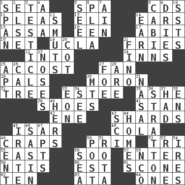 ACROSS 1. Stalk of a moss capsule 5. Health resort 8. Music discs 11. Entreaties 13. Biblical high priest 14. Hearing organs 15. Indian state 16. Car or cant ending 17. "This won't hurt ____!" 18. Fish or hair follower 19. Southern CA. univ. 21. Strips of potato fried in deep fat 22. To the inside or interior of 24. Restaurants 25. Buttonhole 27. Air blower 29. Friends 30. Person of subnormal intelligence 32. Family _ (genealogy) 33. First name in cosmetics 35. American tennis player Robert 39. Imelda's hoard 41. Comedian Laurel of Laurel & Hardy 42. Compass dir. 43. Broken pieces 45. Austrian river, tributary to the Danube 48. Root beer relative 49. Dice game 50. Demure 52. Three (prefix) 55. 90 degrees 56. "Barney Miller" actor Jack 57. Keyboard key 59. Nuclear Threat Initiatives 60. Eastern Standard Time (abbr.) 61. Biscuitlike quick bread 62. Nine, plus one 63. _ moment's notice (2 wds.) 64. Singles DOWN 1. Connect, as a bridge 2. Otherwise 3. One of the two male reproductive glands 4. American Automobile Association (abbr.) 5. Sew up the eyelids of hawks and falcons 6. Entreaty 7. The 18th letter of the Arabic alphabet 8. Apartment or room in a ship 9. Frees from moisture 10. Fast planes 12. Obscenities 14. Merit 20. Small bed 21. A pale, very dry sherry 23. Olfactory organs 25. Fitting 26. Automobile 27. Enemy 28. "We ___ not amused" (Victoria) 30. Mountains (abbr.) 31. Rhinal 33. Age 34. Perceive with the eye 36. Ski resort town in Vermont 37. Possessed 38. Followers of ems 40. Possessive pronoun 43. _-fi 44. Dwellings 45. Feeling or showing extreme anger 46. Indian antelope 47. Flats, for short 49. Penny 50. Mail 51. Roll call or roster of names 53. French philosopher Descartes 54. Angers 56. Ocean 58. Non-commissioned officer (abbr.)