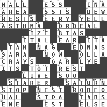 ACROSS 1. Promenade 5. Double-curved letter 8. _ tizzy (2 wds.) 11. Length times width 12. Fast planes 14. Morning condensation 15. Musical pauses 17. Suggestive of the supernatural 18. Shout 19. Respiratory problem 21. Severe or trying experience 23. Ending with capital 25. Prejudice 26. Slanted text style (abbr.) 27. Ewer handle 28. Call ___ day 31. Scottish cap 33. Tired old horse 35. Ferber et al. 37. "Two Mules for Sister ____" 38. Immediately 40. Water jar 41. Trading vessels 43. Rowing implement 45. Sodium hydroxide 46. ___ a Wonderful Life 47. Small child 50. Remainder 52. Not recorded 53. "Barney Miller" actor Jack 54. A viewer who gazes fixedly 56. Titan orbits this 61. Obstruct or block passage 62. Egg locale 65. Cowboy competition 66. Actor Linden 67. Portico 68. Bar bills 69. Compass dir. 70. Eastern Standard Time (abbr.) 71. Otherwise DOWN 1. Hindu Mythology: god of death 2. Ancient Greek god of war 3. For fear that 4. Thin strip of wood or metal 5. Compass dir. 6. Compass dir. 7. Disco prop 8. It may be bright or harebrained 9. 1994 drama film starring Jodie Foster 10. Leather borer 13. Damascus' land 16. Stricken, poetically 18. Consenting reply 20. Muslim summons to prayer 22. Have the gumption 24. Enthusiasm 26. "If ____ say so..." 28. Inwardly 29. Falsehood 30. White ___ sheet 31. Small pie 32. Ancient river in northeast Turkey 34. Thick or sticky substance 36. Dunce 37. _-fi 39. Armed conflicts 42. Use a swizzle stick 44. Vintage cars 48. Baking chambers 49. Cigar-shaped 51. Fly high 52. Pet locale 54. Comedian Laurel of Laurel & Hardy 55. Lacquered or enameled metalware 57. Lug 58. Freehold land 59. Confederate soldiers (slang) 60. Characteristic smell of wine 61. A female animal or person 63. Distress signal 64. Make lace