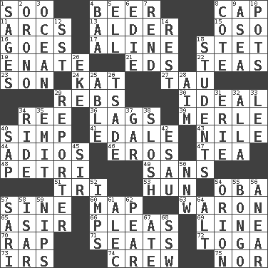 ACROSS 1. "Barney Miller" actor Jack 4. Fermented drink made from hops 8. Head covering 11. Arches 13. Tree or shrub in the Birch family 15. Bear (Spanish) 16. Leaves 17. Place in a line 18. Proofreading order 19. Related on the mother's side 21. Begley and Asner 22. Beverages made from leaves 23. Male offspring 24. Krazy ___ of comics 27. The 19th letter of the Greek alphabet 29. Confederate soldiers (slang) 30. Perfect 34. Portuguese money of account (variant) 36. Straggles 39. Haggard of country music 40. Simple or foolish person 41. Peak District village in England 43. Mediterranean tributary 44. Goodbye (Sp.) 46. Greek god of love 47. Afternoon social gathering 48. _ dish (used to culture cells) 49. Without 51. Three (prefix) 53. Attila the _ 54. Chief or king in Benin or Nigeria 57. Trig term 60. Atlas unit 63. Make _____ (do battle with) 65. SW Saudi Arabia district 66. Entreaties 69. Actor's bit 70. Strike 71. Theater features 72. Ancient Roman robe 73. Big collection agency 74. Group working together 75. And not DOWN 1. Gurus 2. U. of Maine site 3. Sea 4. Sound made by sheep 5. Pipe bend 6. Singer Brickell 7. Tear apart 8. ____ d'Azur (French Riviera) 9. At sea 10. Plant holders 12. Fast jet (abbr.) 14. Relief 18. SAT takers 20. Supplement with great effort 25. Competent 26. Sadhe (variant) 28. Direct toward a target or goal 29. News announcer 31. One of the Great Lakes 32. Silent film actress Nazimova 33. Area sheltered from the wind 34. Travel on an animal 35. Send forth 37. Slender fish 38. Splash clumsily 40. Plant excrement 42. Son of Isaac 45. Title for a knight 50. Compass dir. 52. Naughty children 54. Greek mythologigal hunter 55. Beat drum 56. Approach 57. Indian skirt 58. Austrian river, tributary to the Danube 59. Cuts off 61. Actor Baldwin 62. Lightbulb-shaped fruit 64. The first octave above the treble staff 67. Had dinner 68. Compass dir.