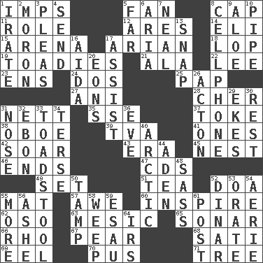 ACROSS 1. Naughty children 5. Avid follower 8. Head covering 11. Hero or heavy, e.g. 12. Ancient Greek god of war 14. Biblical high priest 15. Sports stadium 17. Believer in; advocate of (suffix) 18. Trim (branches) 19. Sycophants 21. Wing 22. Area sheltered from the wind 23. Followers of ems 24. Two (Sp.) 25. Infant food 27. Black tropical American cuckoo 28. "Mermaids" star 31. Remaining after all deductions 35. Compass dir. 37. Casino tip 38. Mitch Miller's instrument 39. Federal power corp. 41. Washington bills 42. Fly high 43. Epoch 45. A home for chicks 46. Conclusions 47. Music discs 49. Arrange properly for use 51. Beverage made from leaves 52. ___ good deed 55. Floor covering 57. Deep reverence 60. Motivate 62. Bear (Spanish) 63. Mesonic 65. Echolocation 66. 17th letter of the Greek alphabet 67. Lightbulb-shaped fruit 68. Suttee (variant) 69. Snakelike fish 70. Purulenc 71. Woody plant DOWN 1. Feeling or showing extreme anger 2. Person of subnormal intelligence 3. Entreaties 4. Transmit 5. Distant 6. Operatic vocal solo 7. Be tempered by heat 8. Portable communications device 9. _ vera 10. Corncob 13. Fastener 16. Opera by Verdi 17. Help 20. Immeasurably long periods of time 26. Gambison 29. Makes supply last 30. Relief 31. Olfactory organ 32. Inky black, to poets 33. Inedible or poisonous agaric 34. Laconic 36. First lady 40. Northern region 44. An important port of Yemen 48. Backtalk 50. Pack (down) 52. Middle Eastern gold or silver currency 53. Declaim 54. Nest on high 55. Greater amount 56. American tennis player Robert 58. Shed a tear 59. Son of Isaac 61. Mail 64. Big collection agency