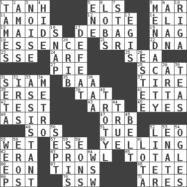 ACROSS 1. Hyperbolic tangent 5. Raised railways 8. Spoil 11. Mine, in Marseilles 12. Short letter 14. Biblical high priest 15. Unmarried girls 17. Debunk (Brit. slang) 18. Tired old horse 19. Gist 21. Indian title of respect (Mr.) 22. Heredity factor (abbr.) 23. Compass dir. 24. Sandy's bark 25. Ocean 27. Sliced dessert 28. Jazz singing style 31. Thailand, formerly 35. Sound made by sheep 37. Hoop that covers a wheel 38. Celtic language 39. Make lace 41. Singer James 42. Trial 43. Tate display 45. Snake ____ (dice throw) 46. SW Saudi Arabia district 47. Globe 49. Distress signal 51. Third day of the wk. 52. Lion 55. Dripping 57. Compass dir. 60. Crying or shouting loudly 62. Epoch 63. Move like a hungry wolf 65. Add up to 66. A really long time 67. Canisters 68. False hair 69. Pacific Standard Time (abbr.) 70. Compass dir. 71. Ancient Greek god of war DOWN 1. Domesticates 2. Collect or gather 3. Annoying sound 4. Flintstone garb 5. Compass dir. 6. Tennis shots 7. Play the lead 8. Ananias' fault 9. Actor Alda or Thicke 10. Port city in Latvia 13. The front part of a cuirass 16. Fastener 17. Outscore 20. Baby bed with high sides 26. First name in cosmetics 29. Johnson of "Laugh-In" 30. Afternoon social gatherings 31. Bristle 32. Angers 33. Helper 34. Paris' subway 36. Auto club (abbr.) 40. Trinitrotoluene 44. Loyal 48. Waist strap 50. Back-to-school mo. 52. 61 cubic inches 53. Maternal 54. Stares 55. Shed a tear 56. Greek god of love 58. Indian titles of respect 59. Immeasurably long periods of time 61. Globular water bottle used in Asia 64. Compass dir.