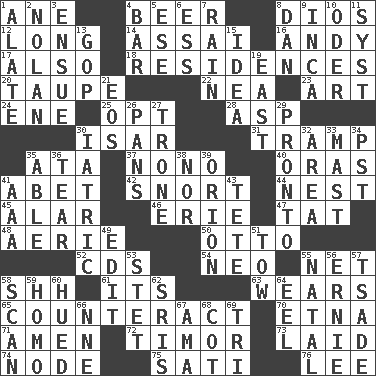 ACROSS 1. One (Scot) 4. Fermented drink made from hops 8. "Vaya con ____" 12. Protracted 14. Slender Brazilian palm 16. Actor Griffith 17. In addition 18. Homes 20. Grayish beige 22. Teachers' org. 23. Tate display 24. Compass dir. 25. Choose 28. Cleo's killer 30. Austrian river, tributary to the Danube 31. _____ steamer (cargo ship) 35. _ moment's notice (2 wds.) 37. Words to Nanette 40. Mouths or openings 41. Collude with 42. Derisive sound 44. Egg locale 45. Having or resembling wings 46. One of the Great Lakes 47. Make lace 48. Nest on high 50. Von Bismarck 52. Music discs 54. Modern: prefix 55. Fish or hair follower 58. Quiet! 61. It is 63. Erodes 65. Frustrate 70. Inactive volcano in Sicily 71. So be it 72. Southeast Indonesia island 73. Put down 74. Connecting point 75. Suttee (variant) 76. Area sheltered from the wind DOWN 1. Having winglike extensions 2. Pitcher Ryan 3. Take place subsequently 4. Drinking establishment 5. Compass dir. 6. Double-curved letter 7. Precipitation 8. Daniel's nick name 9. South American Indian 10. Baltic tributary 11. System (abbr.) 13. Grand Old Party 15. It may be bright or harebrained 19. Compass direction 21. Greek goddess of the dawn 26. Zero-star reviews 27. Marketplace scale 29. Right away 30. Of or pertaining to medicine 32. Length times width 33. Vertical spar for supporting sails 34. Pacific Standard Time (abbr.) 35. Competent 36. Lacerate 38. Or not 39. Constellation of myth 41. Auto club (abbr.) 43. False hair 49. Prepare for publication 51. Pull behind 53. Proofreading order 55. Brizilian seaport 56. Bert's buddy 57. Sadhe (variant) 58. Examine minutely or intensely 59. Like (prefix) 60. Took on color 62. Indian titles of respect 64. Snakelike fish 66. Compass dir. 67. Housemaid (var.) 68. Small bed 69. Three (prefix)