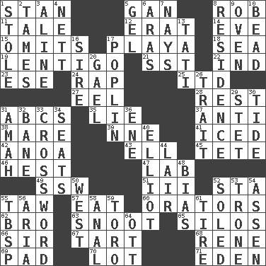 ACROSS 1. Comedian Laurel of Laurel & Hardy 5. Separate the seeds from cotton 8. Director Reiner 11. Lie 12. Part of Q.E.F. 14. First lady 15. Leaves out 17. Beach, in Buenos Aires 18. Ocean 19. Small, flat, pigmented spot on the skin 21. Fast jet (abbr.) 22. Working for oneself (abbr.) 23. Compass dir. 24. Hit sharply and swiftly 25. It would 27. Snakelike fish 28. Repose 31. Lettered men learn these first 35. Untruth 37. Opposed to 38. Female horse 39. Compass dir. 41. On the rocks 42. Small Philippine buffalo 43. Pipe bend 45. Wig 46. Command 47. Experiment locale 49. Compass dir. 51. One more than two 52. R.R. building 55. The 23rd letter of the Hebrew alphabet 57. Consume 60. Speakers 62. Sis' sibling 63. Snob 65. Grain storage towers 66. Title for a knight 67. Small pie 68. French philosopher Descartes 69. Writing tablet 70. Car dealer's back yard 71. Genesis locale DOWN 1. Fur scarf 2. Domesticates 3. Place in a line 4. Remaining after all deductions 5. Set 6. Ancient river in northeast Turkey 7. Negative votes 8. Home 9. Baking chamber 10. Necklace unit 13. Jacques of French films 16. Beget 17. Cotton for raincoats, e.g. 20. Highlander 26. Distinguishing feature 29. Proofreading order 30. Periodic rise and fall of the sea level 31. Nursemaid 32. Object of repulsion 33. What you're doing now 34. Theater features 36. Compass dir. 40. American author Paul (1891-1958) 44. Den 48. Prejudice 50. Compass direction 52. Having a sole or soles 53. Marketplace scale 54. NE Netherlands city 55. Cook's measure (abbr.) 56. Operatic vocal solo 58. Of or related to the anus 59. "Corrida" creature 61. Become fatigued 64. Baseball player Mel