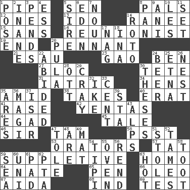 ACROSS 1. Corncob 5. Elected rep. 8. Friends 12. Singles 13. Wedding promise 14. The wife of a rajah (variant) 15. Without 16. One who advocates reunion 19. Conclusion 20. Pre-World Series prize 21. Son of Isaac 23. E Mali city 24. Benjamin's nick name 27. Alliance 30. False hair 31. Of or pertaining to medicine 34. Coop moms 35. Among 38. Receives possession of 40. Part of Q.E.F. 41. To erase 42. Gossips 44. Mild oath 45. Falsehood 46. Title for a knight 47. Scottish cap 50. Inconspicuous attention getter 53. Speakers 57. Make lace 59. Supplementary 63. Like (prefix) 64. Related on the mother's side 65. Animal enclosure 66. Margarine 67. Opera by Verdi 68. Working for oneself (abbr.) 69. Trial DOWN 1. Introduce or present, as a question 2. Empty; void 3. Depends 4. Curvy letter 5. The founder of a family 6. Genesis locale 7. Part of speech 8. Baking dish 9. Cuckoo 10. French article 11. Arrange properly for use 14. Printing process, for short 17. Tired old horse 18. _ tizzy (2 wds.) 20. Monetary unit of Botswana 22. Stayed 24. Fermented drink made from hops 25. Inactive volcano in Sicily 26. A home for chicks 28. Baseball player Mel 29. Supercomputer manufacturer 30. College papers 32. Eisenhower's nickname 33. Penny 35. Ancient Greek god of war 36. Wise men 37. Austrian river, tributary to the Danube 39. R.R. building 43. High mountains 47. Lacquered or enameled metalware 48. "We ___ not amused" (Victoria) 49. Floor protector 51. Took without asking 52. Domesticates 54. Native american tent (variation) 55. Baking chamber 56. Tear apart 58. A blast of a horn 59. Ocean 60. Single; one (prefix) 61. Writing tablet 62. Parent Teacher Assoc. 63. Being at a high temperature