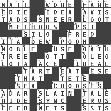 ACROSS 1. Electrical Unit 5. Had on 9. Conductor's collection 13. Singer Brickell 14. The content of cognition 15. Advice 16. Bits 17. Contemptuous expression 18. Plunder 19. Modes 21. 23rd letter of the Greek alphabet 22. Grain storage tower 23. Flintstone 24. Call ___ day 27. Morning condensation 28. "Silly old bear" 29. Having high moral qualities 31. Purpose 32. Pledge 36. Relationship diagram 37. Baseball player Mel 38. Margarine 39. Globular water bottle used in Asia 40. Adept person 41. Perfect 42. Small pie 44. Consume 46. Compass dir. 47. Not this but _ 48. Wig 50. Ocean 51. Opts 54. The sixth month of the Jewish calendar 56. Killed 58. Falsehood 60. Travel on or in a vehicle 61. Synchronize (abbr.) 62. Greek god of love 63. Nourish 64. Moistens 65. Fast planes DOWN 1. Dripping 2. First of billions? 3. Event that recurs at intervals 4. Trials 5. Light entry point 6. Lyric poems 7. To sift 8. Hearing organ 9. It jiggles the polygraph 10. Shun 11. River (Sp.) 12. Eastern Standard Time (abbr.) 17. Not divided or shared with others 20. Flintstone garb 21. Adept person 23. Enemy 24. International (abbr.) 25. "Corrida" creature 26. Collude with 28. Pacific Standard Time (abbr.) 30. Resembling or made to resemble leather 31. Shoshoni 33. Toward shelter 34. Afternoon social gatherings 35. Opening into or through something 37. Sep. follower 40. Nonscientific branch of learning 41. "Tell ____ the Marines!" 43. Auto club (abbr.) 44. Value system 45. A really long time 47. Sadhe (variant) 49. _____ Park, CO 51. Patter 52. Hearing organs 53. Notch 54. Sandy's bark 55. Pass on 56. Compass dir. 57. Sodium hydroxide 59. Double-curved letter