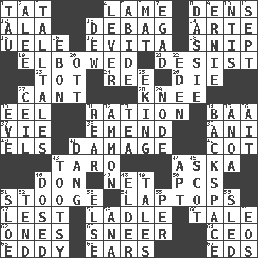ACROSS 1. Make lace 4. Unable to walk 8. Cub Scout units 12. Wing 13. Debunk (Brit. slang) 14. Johnson of "Laugh-In" 15. Ubangi River tributary 17. Webber/Rice musical 18. Sever or remove by pinching or nipping 19. Turned at an angle; bent 21. Stop 23. Small child 24. To separate or throw off 26. Expire 27. Patter 28. Leg joint 30. Snakelike fish 31. Food allowance for one day 34. Sound made by sheep 37. Compete 38. Make improvements or corrections to 39. Cuckoo 40. Raised railways 41. Break 42. Small bed 43. Edible starchy tuberous root 44. "____ silly question..." 46. Spanish title 47. Fish or hair follower 50. Personal Computers (abbr.) 51. Moe Howard, for one 54. Portable computers 57. For fear that 58. Dipping utensil 60. Story 62. Singles 63. Contemptuous expression 64. Corporate head (abbr.) 65. Whirlpool 66. Hearing organs 67. Begley and Asner DOWN 1. The 19th letter of the Greek alphabet 2. Toward shelter 3. Baron Munchausen's specialties 4. Prying instrument 5. Stay 6. Floor protector 7. Mild oath 8. Hyrax 9. Bert's buddy 10. Nuclear Threat Initiatives 11. Back-to-school mo. 13. Morning condensation 16. Inky black, to poets 20. Baseball player Mel 22. Genesis locale 25. Supplementing with great effort 27. To provide with a ceiling 29. Thickened enlargement 30. Night before a holiday 31. Buttocks 32. ID or VA city 33. Beverage made from leaves 34. Keyboard key 35. Small Philippine buffalo 36. Small island 41. Mild oath, euphamism for damn 43. Tootsie (variant) 44. Fitting 45. Native of Scotland 46. Administered medicine 48. A person who is older than you are 49. Falsehoods 51. A type of plum 52. Look after 53. Otherwise 55. For each 56. Downhill vehicle 59. Santa ___, CA 61. Greek goddess of the dawn