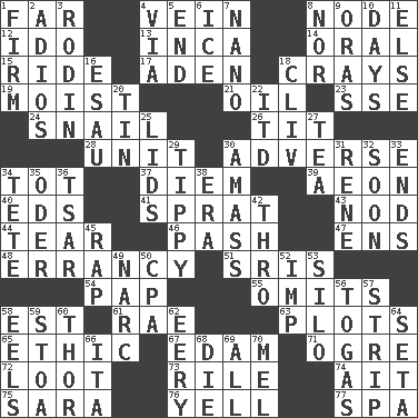 ACROSS 1. Distant 4. Distinctive style or manner 8. Thickened enlargement 12. Wedding promise 13. South American Indian 14. Spoken 15. Travel on an animal 17. Arabian gulf 18. Trading vessels 19. Damp 21. Petroleum 23. Compass dir. 24. Slow-paced one 26. Teat (slang) 28. A single undivided whole 30. Contrary to your interests or welfare 34. Small child 37. South Vietnam president (1954) 39. A really long time 40. Begley and Asner 41. Small fatty European fish 43. Lower and raise head in agreement 44. Pull apart 46. Romantic infatuation 47. Followers of ems 48. Tendancy to err 51. Indian titles of respect 54. Infant food 55. Leaves out 58. Eastern Standard Time (abbr.) 61. Actress Charlotte 63. Schemes 65. Principle of right and wrong 67. Dutch treat 71. Legendary monster 72. Spoils 73. Cause heat under the collar 74. Small island 75. "Two Mules for Sister ____" 76. Shout 77. Health resort DOWN 1. Not soft or yielding to pressure 2. Goodbye (Sp.) 3. "The Thinker" sculptor 4. By way of 5. Conclude 6. Frozen water 7. Billionth: prefix 8. Not either 9. Mouths or openings 10. 24-hour periods 11. Otherwise 16. Son of Isaac 18. 154 in Roman numerals 20. Shallow baking pan 22. It would 25. Flaplike coverings 27. Afternoon social gathering 29. Likely to tip or tilt 30. Collect or gather 31. French philosopher Descartes 32. Within a short period 33. Conclusions 34. False hair 35. River in Europe 36. Russian ruler of old 38. Period 42. Through, poetically 45. Hit sharply and swiftly 49. Drug cop 50. Accounting whiz (abbr.) 52. Mischievous child 53. Grain storage tower 56. Ancient Roman robes 57. Empty completely 58. Snakelike fish 59. Portico 60. Son of Odin 62. Suggestive of the supernatural 64. Stalk of a moss capsule 66. Call ___ day 68. Pass on 69. Everything 70. Cartoonist voice _ Blanc